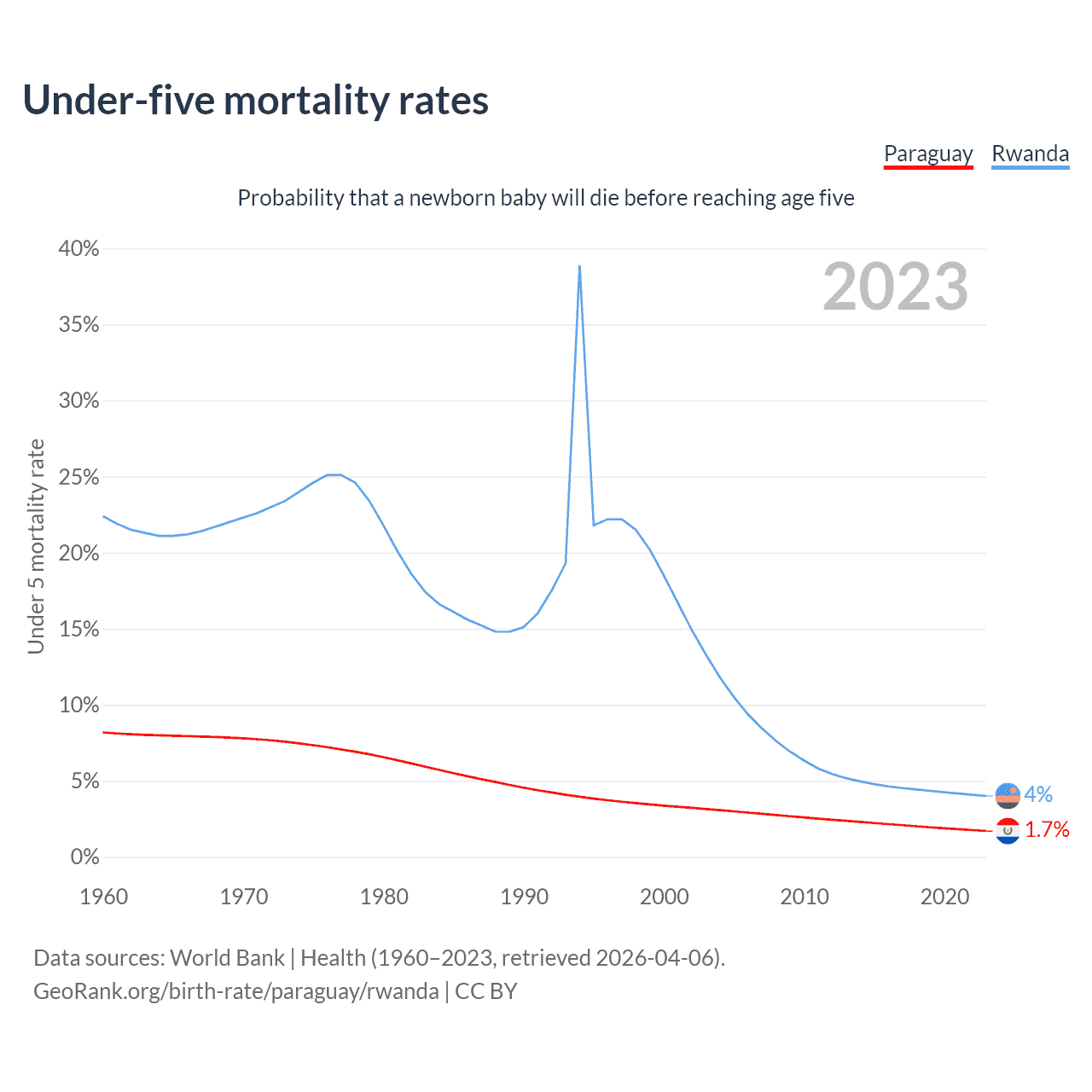 The chance that a newborn baby will die before reaching age five is 1.7% in Paraguay and 4% in Rwanda. Above is a chart with historical data on under-five mortality rates.