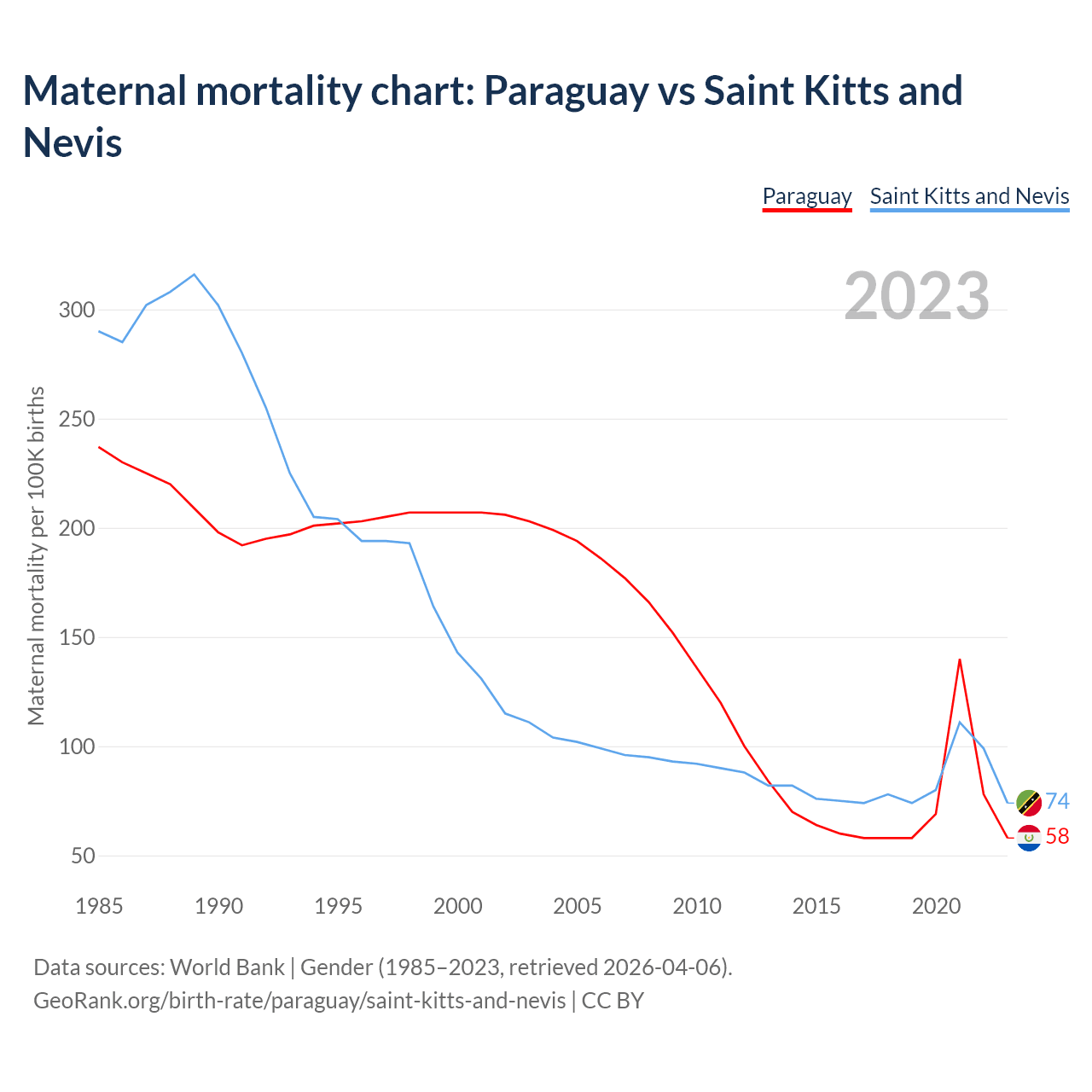 The maternal mortality rate, which is the probability of dying during childbirth or within 42 days of pregnancy termination, is 58 deaths per 100,000 live births in Paraguay, compared to 74 deaths in Saint Kitts and Nevis.