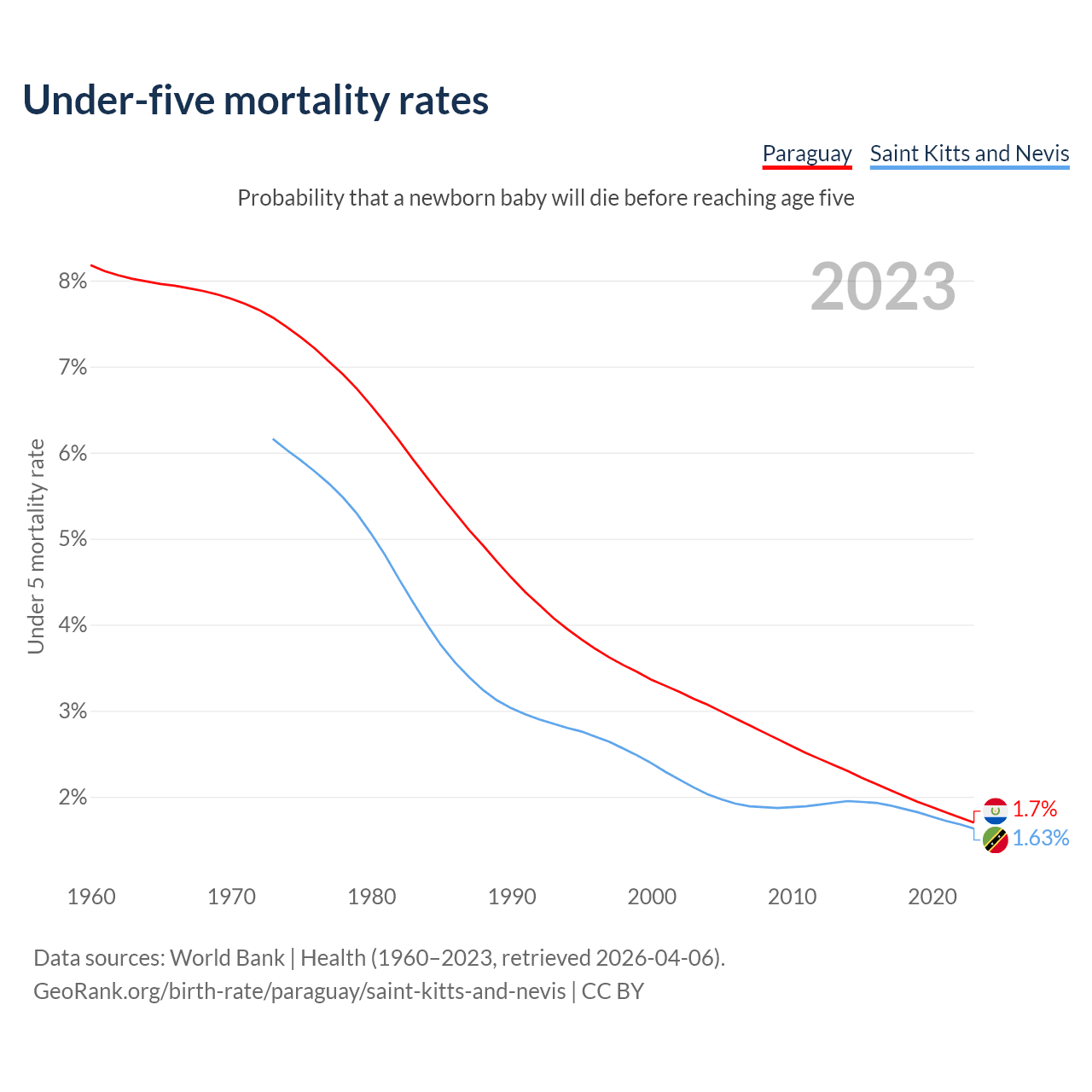 The chance that a newborn baby will die before reaching age five is 1.7% in Paraguay and 1.63% in Saint Kitts and Nevis. Above is a chart with historical data on under-five mortality rates.