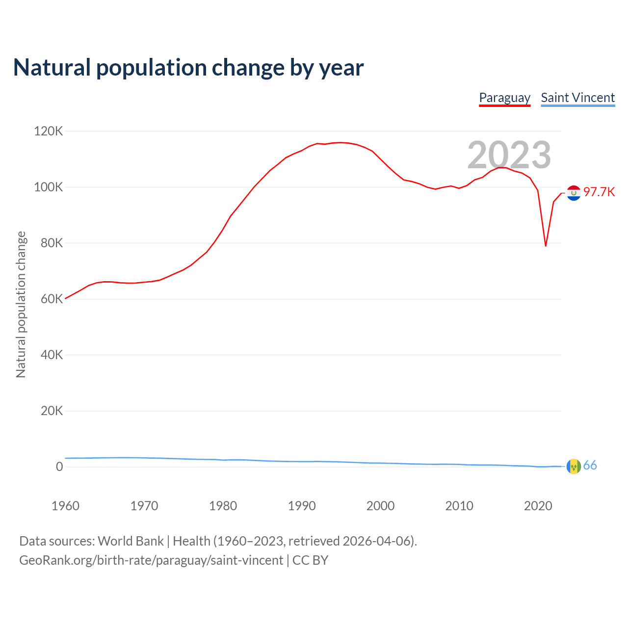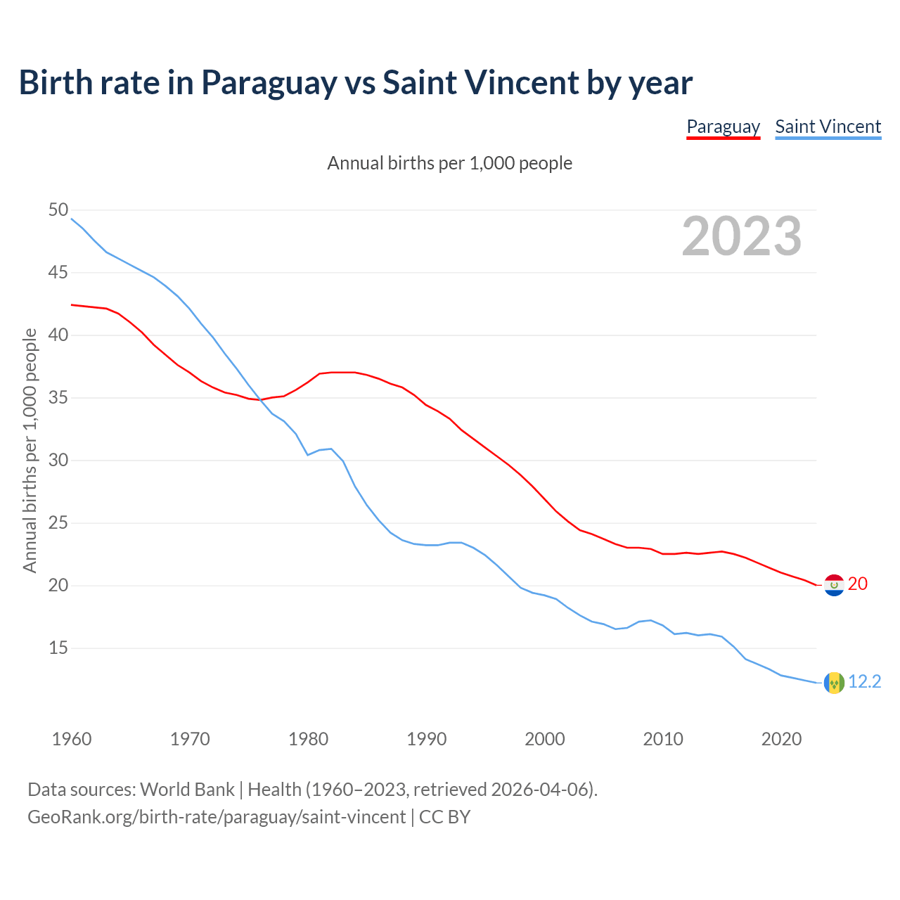Paraguay has an annual birth rate of 20 births per 1,000 people, compared to 12.2 for Saint Vincent. The average number of children a woman is expected to have during her lifetime — the fertility rate, is 2.42 in Paraguay and 1.78 in Saint Vincent — 26.7% difference.