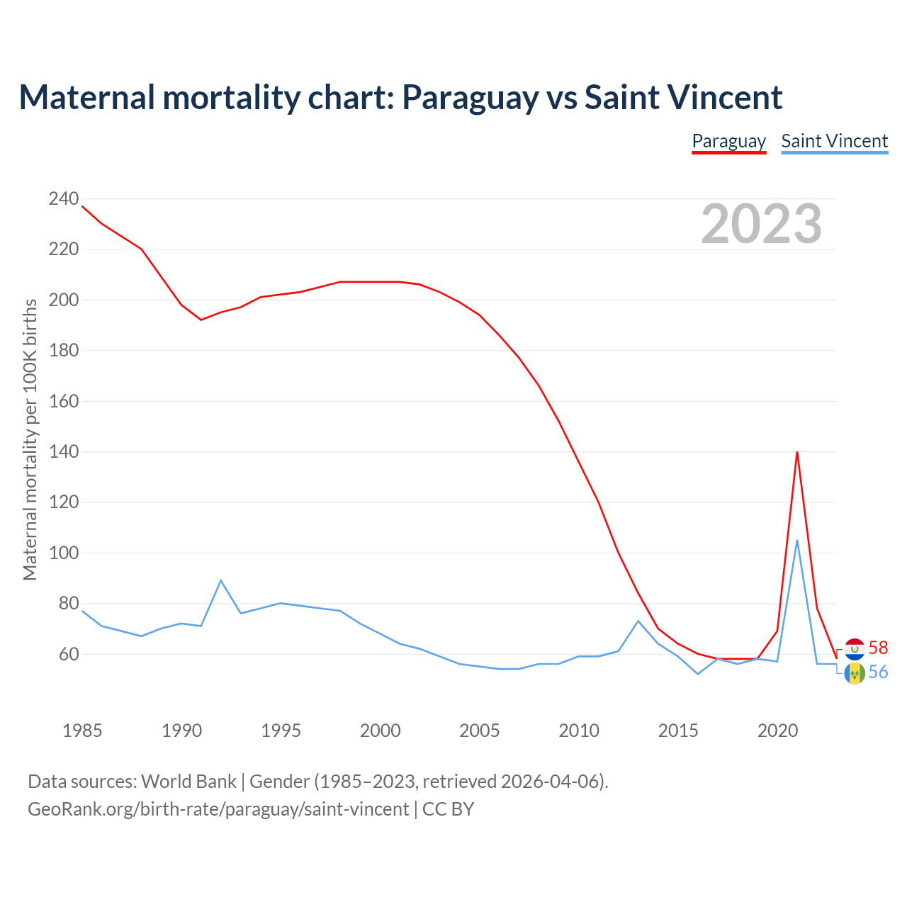 The maternal mortality rate, which is the probability of dying during childbirth or within 42 days of pregnancy termination, is 58 deaths per 100,000 live births in Paraguay, compared to 56 deaths in Saint Vincent.
