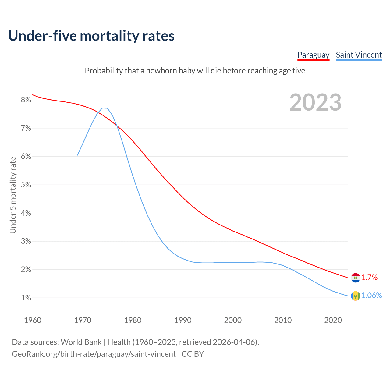 The chance that a newborn baby will die before reaching age five is 1.7% in Paraguay and 1.06% in Saint Vincent. Above is a chart with historical data on under-five mortality rates.