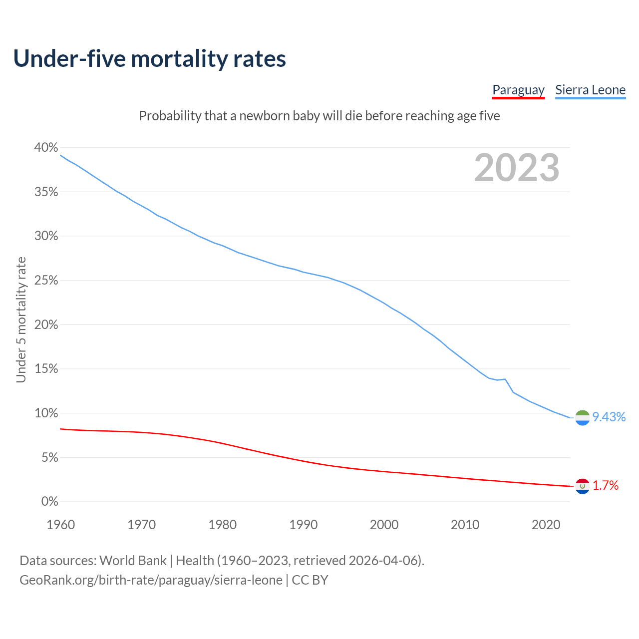 The chance that a newborn baby will die before reaching age five is 1.7% in Paraguay and 9.43% in Sierra Leone. Above is a chart with historical data on under-five mortality rates.