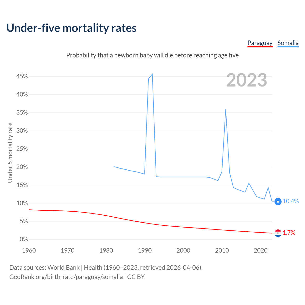 The chance that a newborn baby will die before reaching age five is 1.7% in Paraguay and 10.4% in Somalia. Above is a chart with historical data on under-five mortality rates.