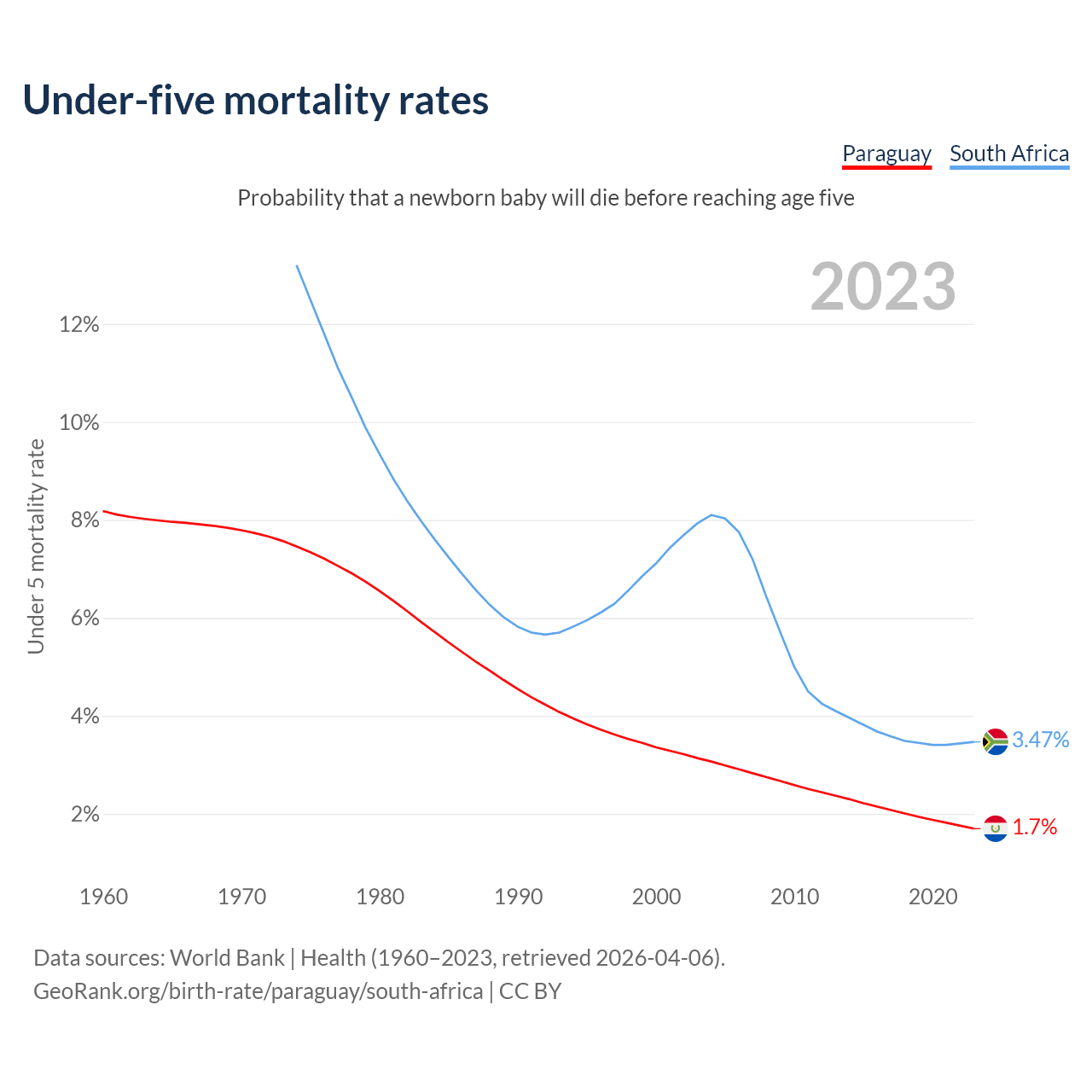 The chance that a newborn baby will die before reaching age five is 1.7% in Paraguay and 3.47% in South Africa. Above is a chart with historical data on under-five mortality rates.