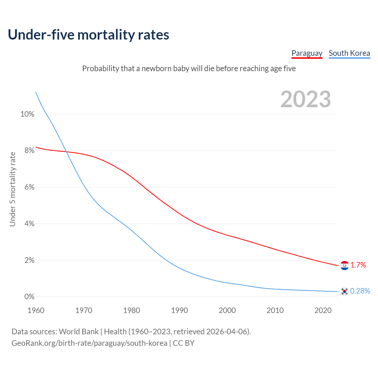 The chance that a newborn baby will die before reaching age five is 1.7% in Paraguay and 0.28% in South Korea. Above is a chart with historical data on under-five mortality rates.