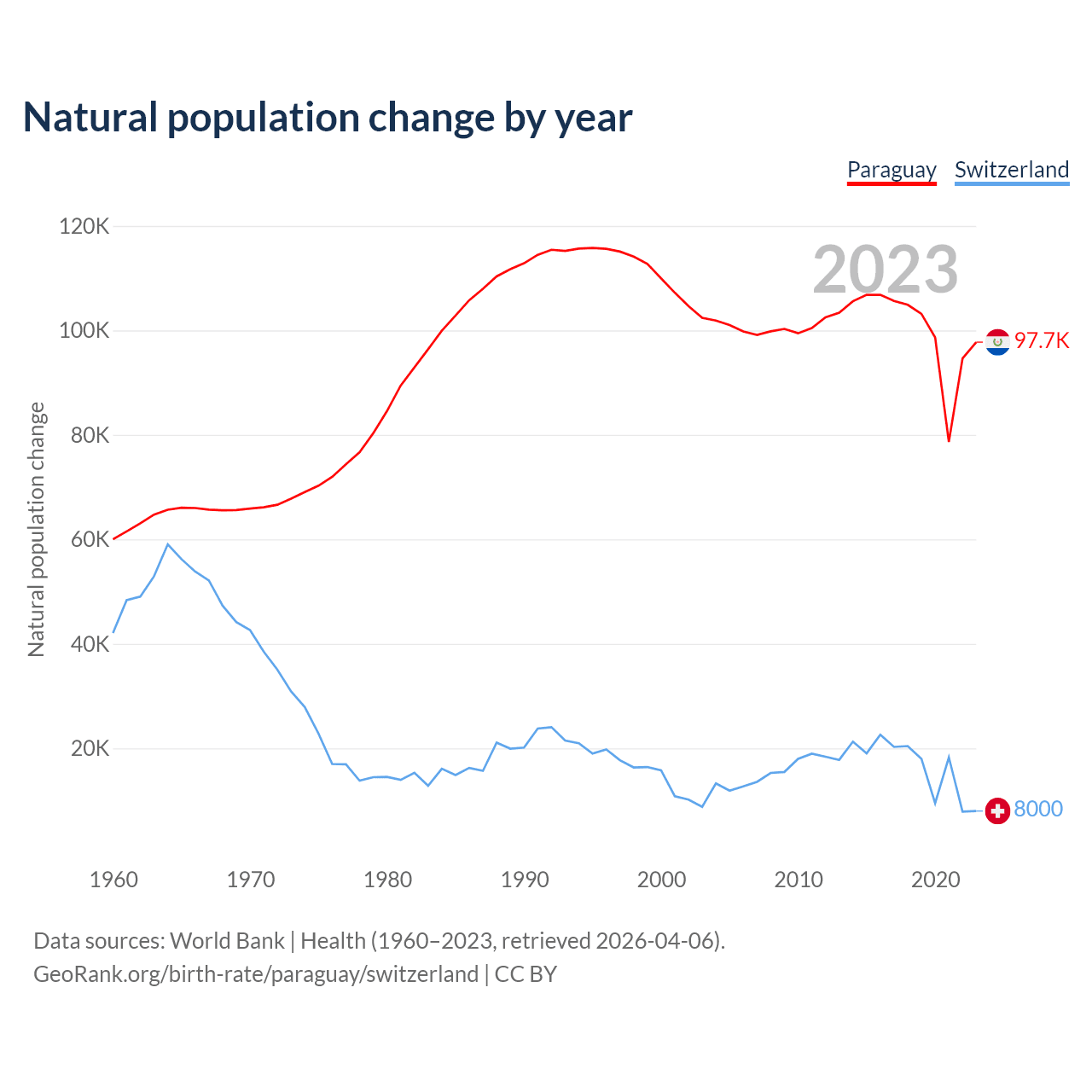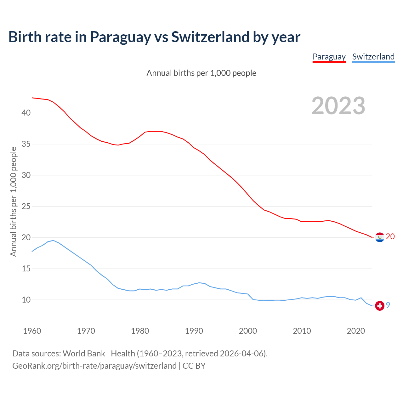 Paraguay has an annual birth rate of 20 births per 1,000 people, compared to 9 for Switzerland. The average number of children a woman is expected to have during her lifetime — the fertility rate, is 2.42 in Paraguay and 1.33 in Switzerland — 45.1% difference.
