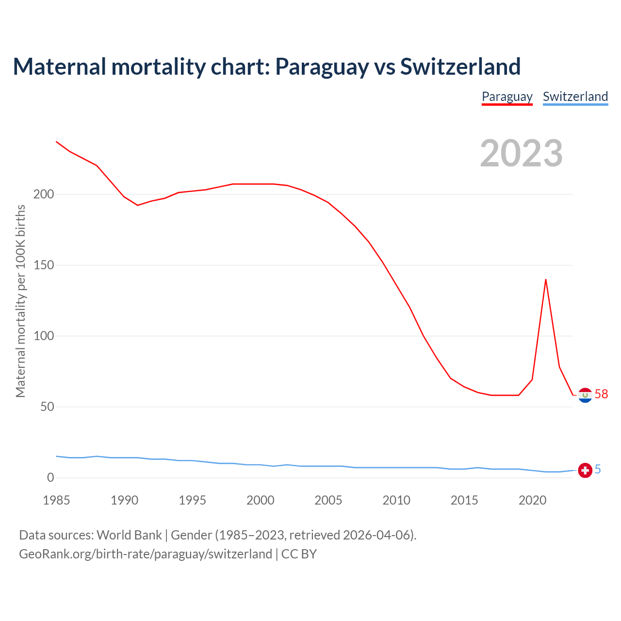 The maternal mortality rate, which is the probability of dying during childbirth or within 42 days of pregnancy termination, is 58 deaths per 100,000 live births in Paraguay, compared to 5 deaths in Switzerland.