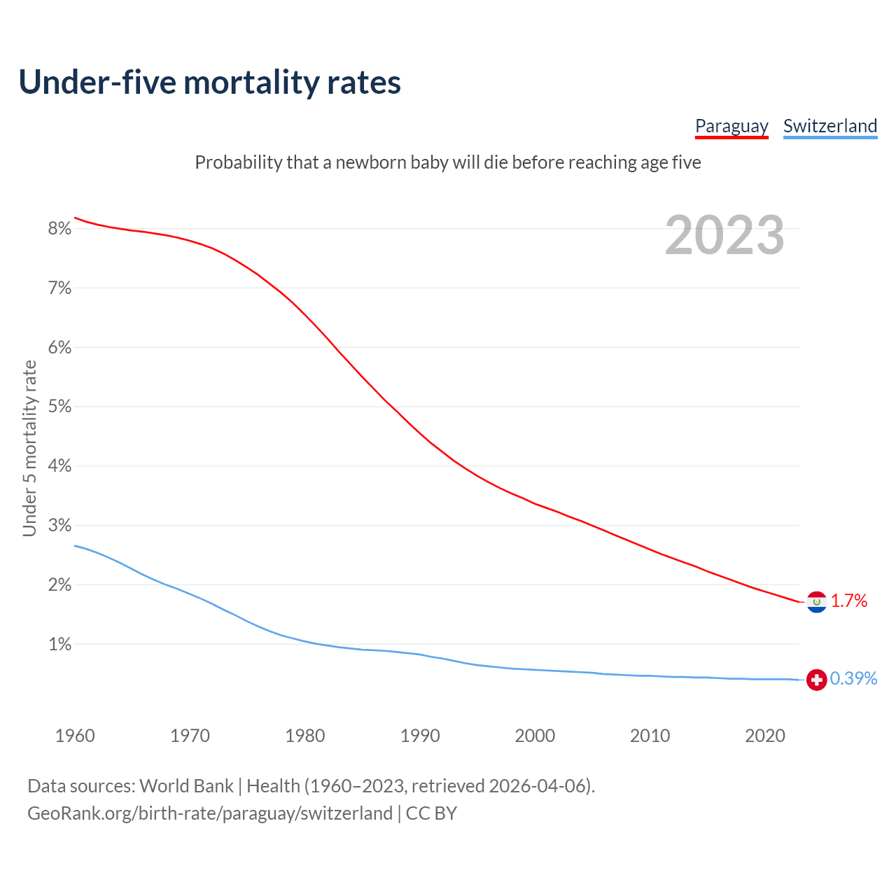 The chance that a newborn baby will die before reaching age five is 1.7% in Paraguay and 0.39% in Switzerland. Above is a chart with historical data on under-five mortality rates.