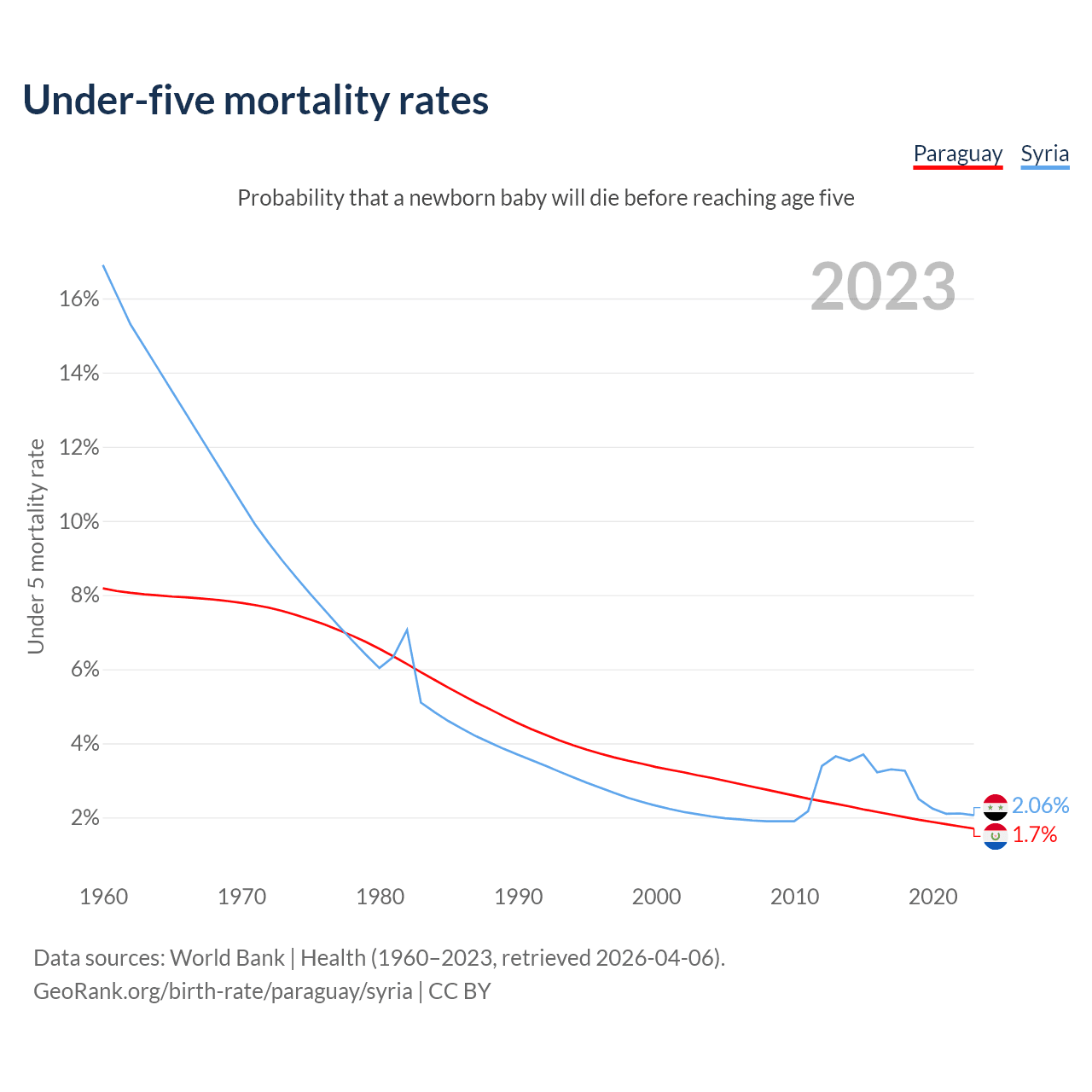 The chance that a newborn baby will die before reaching age five is 1.7% in Paraguay and 2.06% in Syria. Above is a chart with historical data on under-five mortality rates.