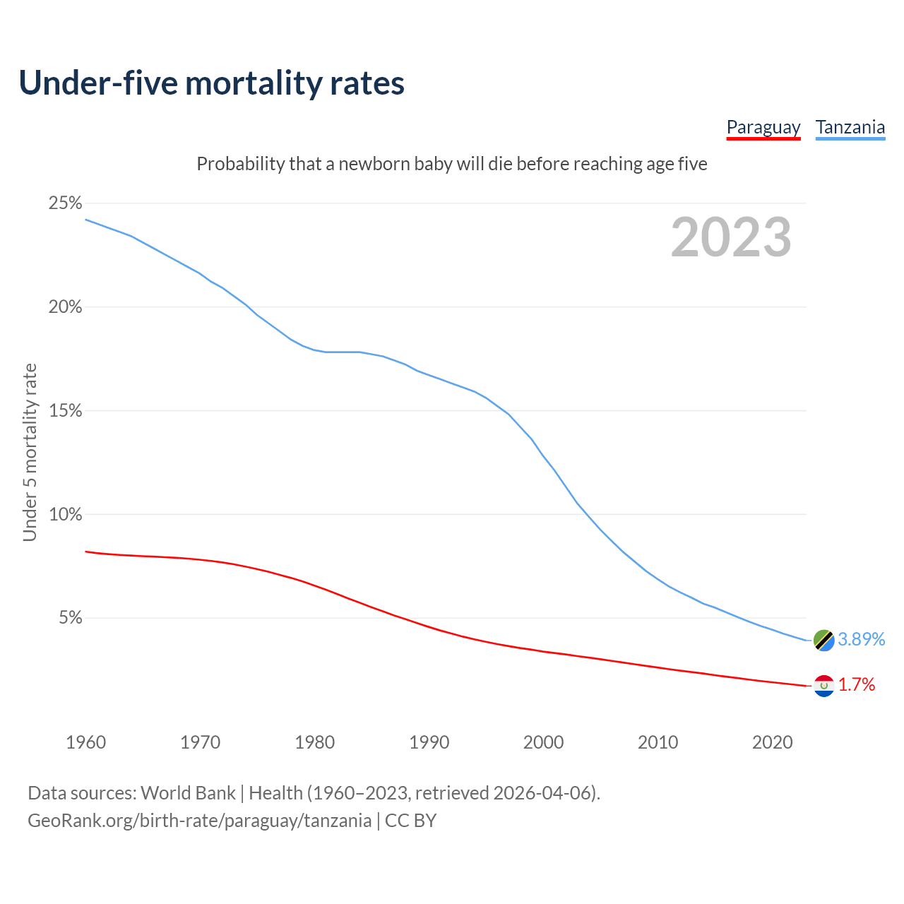 The chance that a newborn baby will die before reaching age five is 1.7% in Paraguay and 3.89% in Tanzania. Above is a chart with historical data on under-five mortality rates.