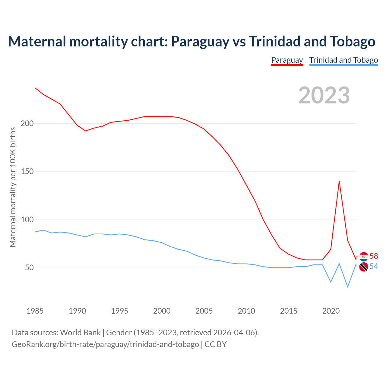 The maternal mortality rate, which is the probability of dying during childbirth or within 42 days of pregnancy termination, is 58 deaths per 100,000 live births in Paraguay, compared to 54 deaths in Trinidad and Tobago.