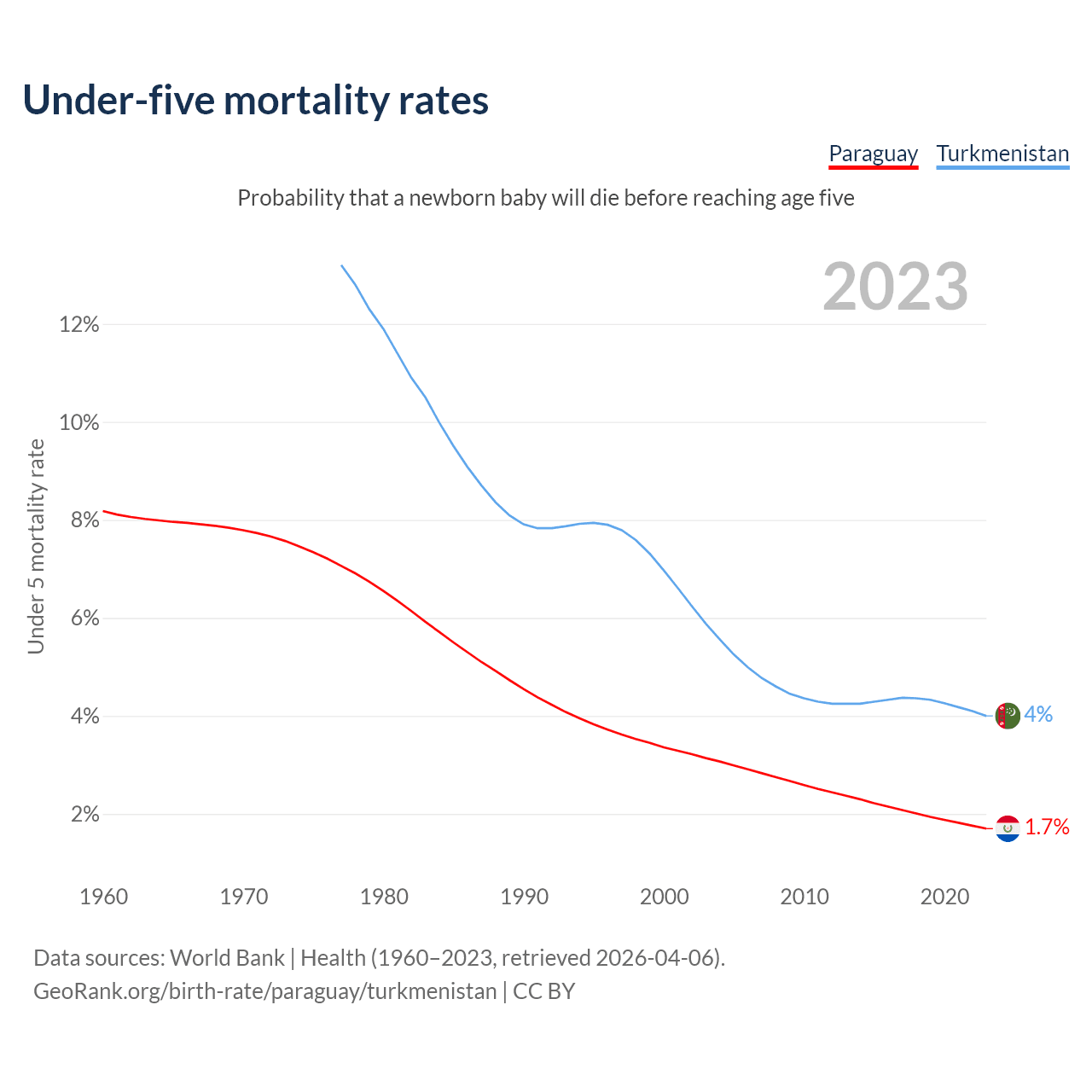 The chance that a newborn baby will die before reaching age five is 1.7% in Paraguay and 4% in Turkmenistan. Above is a chart with historical data on under-five mortality rates.