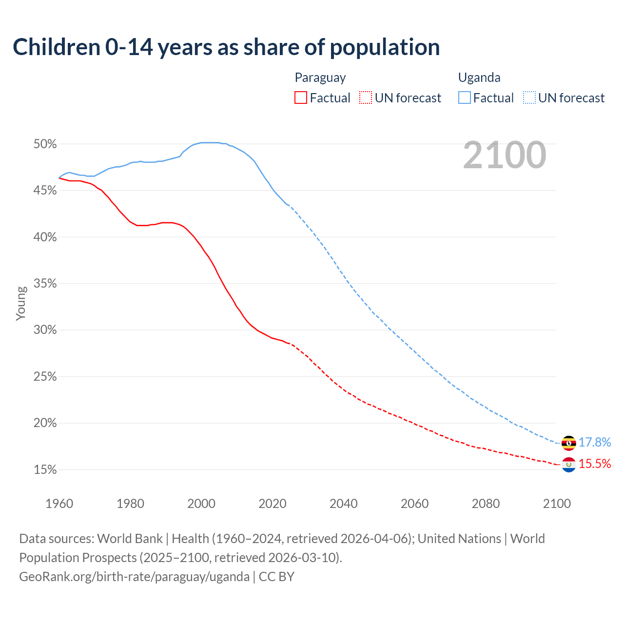 According to the latest available data on birth rates, the fertility rate in Paraguay was 2.42 children per woman in 2023, compared to 4.28 in Uganda in 2023. The replacement level is considered to be 2.1 children per woman.