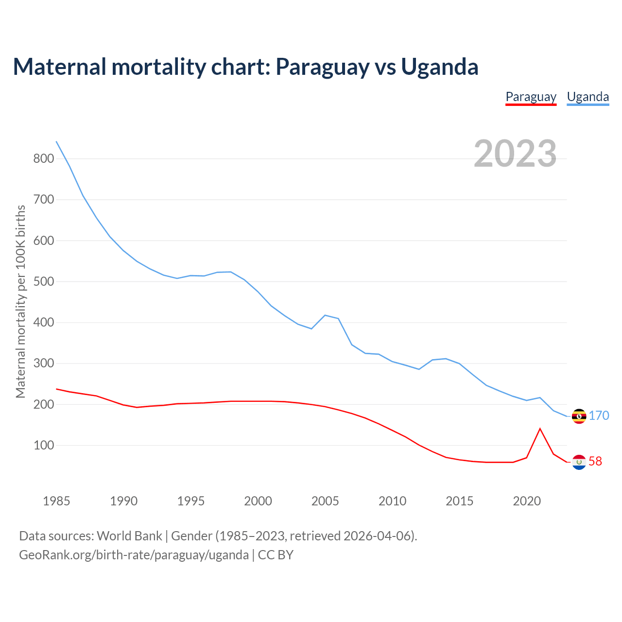 - Annual births per 1,000 women ages 15-19 (adolescent birth rate or teenage mother rate) is 70.3 in Paraguay vs 107 in Uganda.