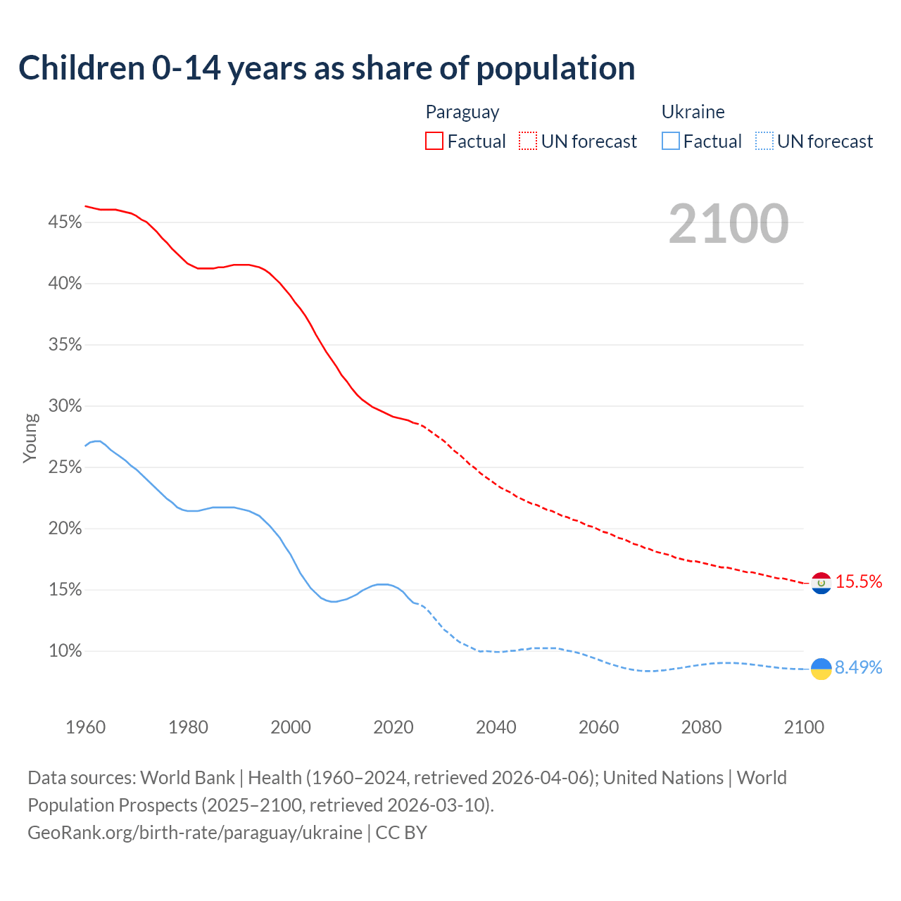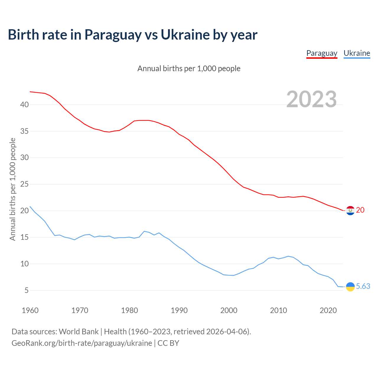 Paraguay has an annual birth rate of 20 births per 1,000 people, compared to 5.63 for Ukraine. The average number of children a woman is expected to have during her lifetime — the fertility rate, is 2.42 in Paraguay and 0.98 in Ukraine — 59.7% difference.