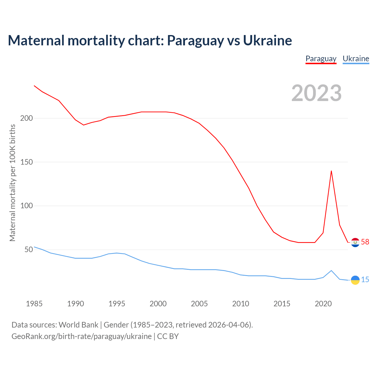The maternal mortality rate, which is the probability of dying during childbirth or within 42 days of pregnancy termination, is 58 deaths per 100,000 live births in Paraguay, compared to 15 deaths in Ukraine.