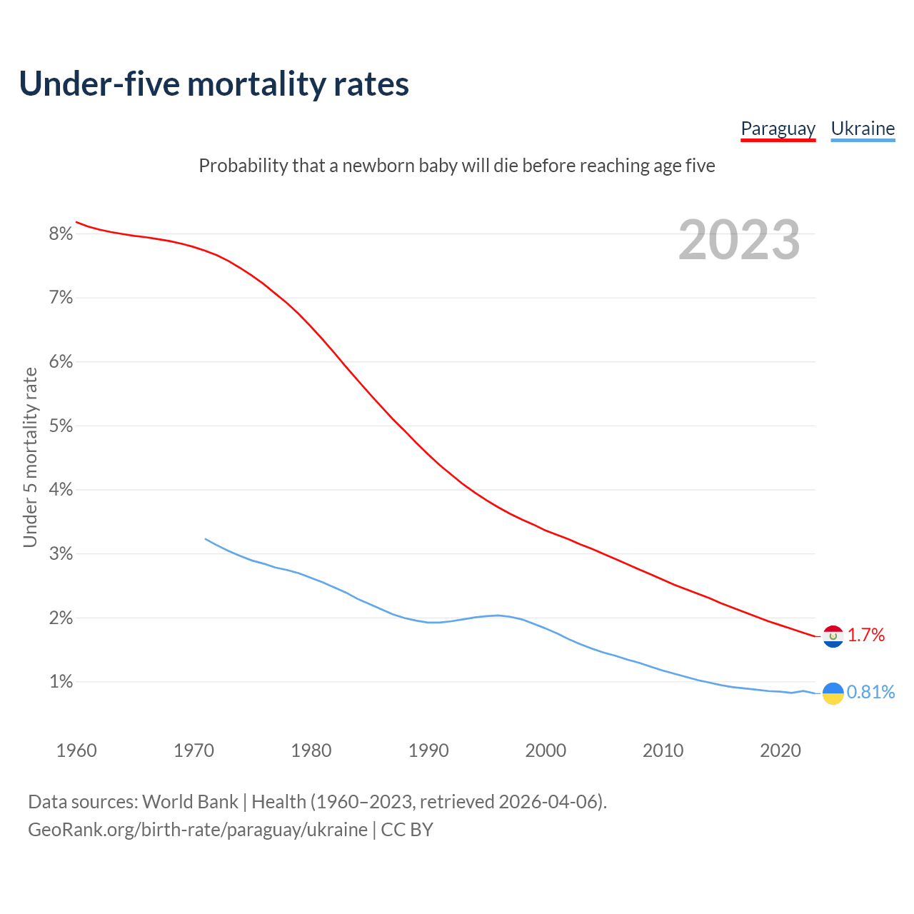 The chance that a newborn baby will die before reaching age five is 1.7% in Paraguay and 0.81% in Ukraine. Above is a chart with historical data on under-five mortality rates.
