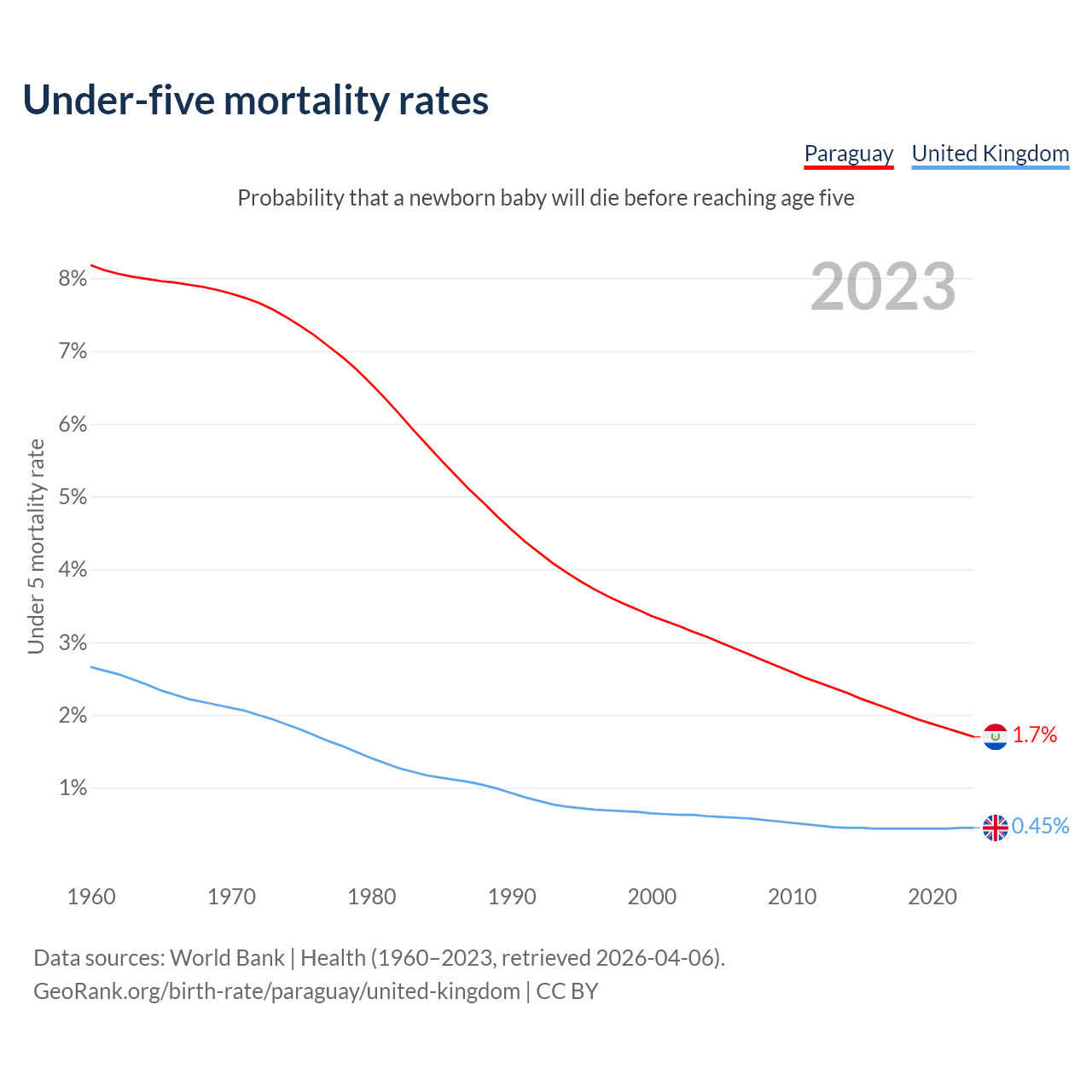 The chance that a newborn baby will die before reaching age five is 1.7% in Paraguay and 0.45% in the United Kingdom. Above is a chart with historical data on under-five mortality rates.