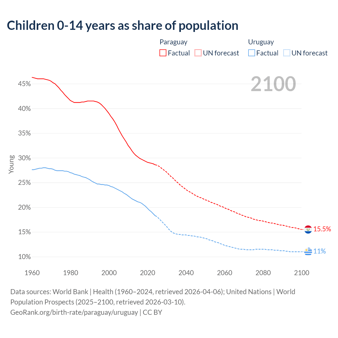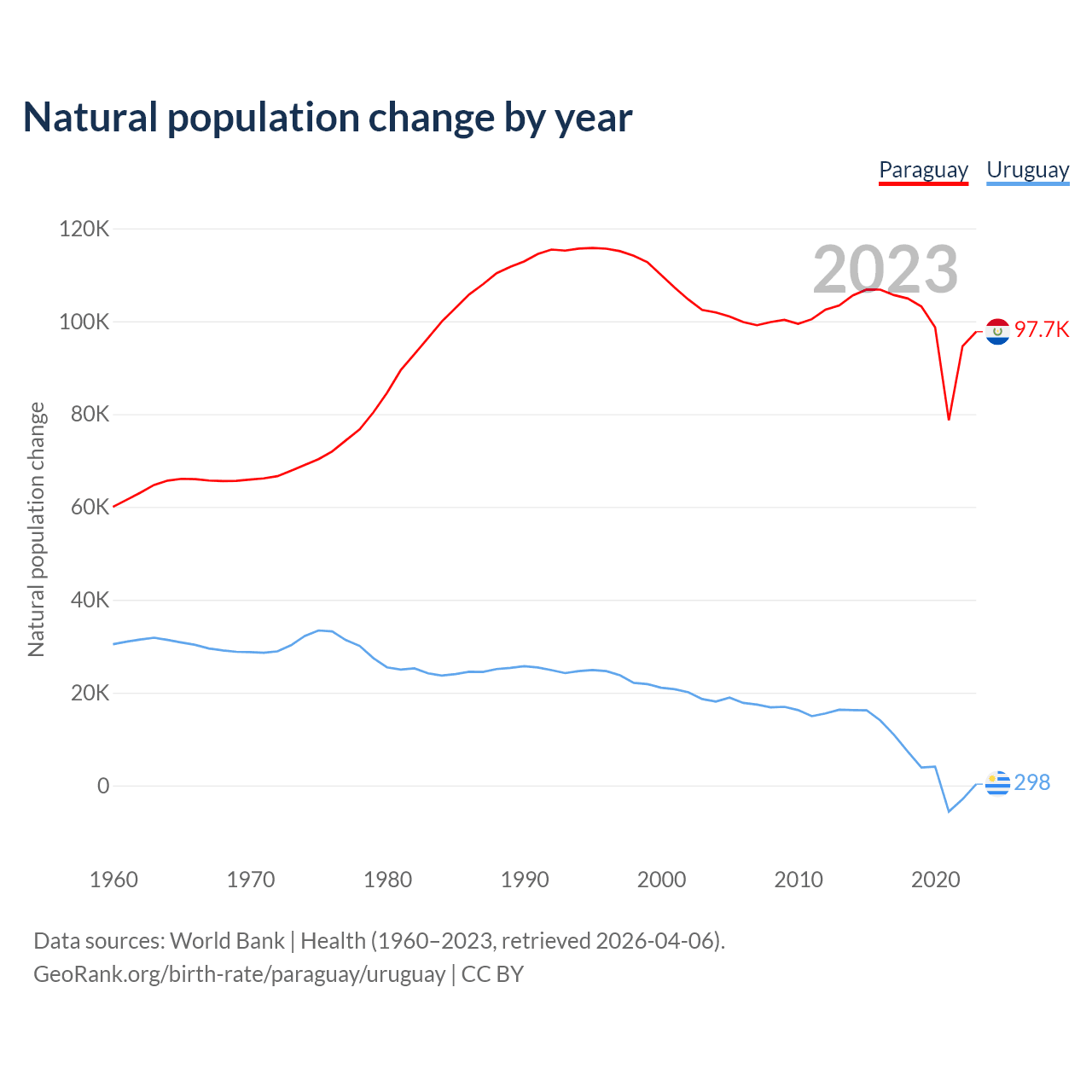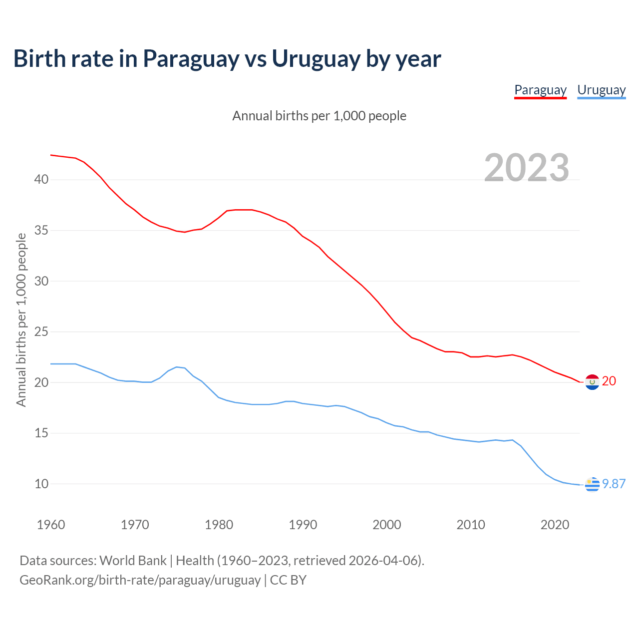 According to the latest available data on birth rates, the fertility rate in Paraguay was 2.42 children per woman in 2023, compared to 1.41 in Uruguay in 2023. The replacement level is considered to be 2.1 children per woman.