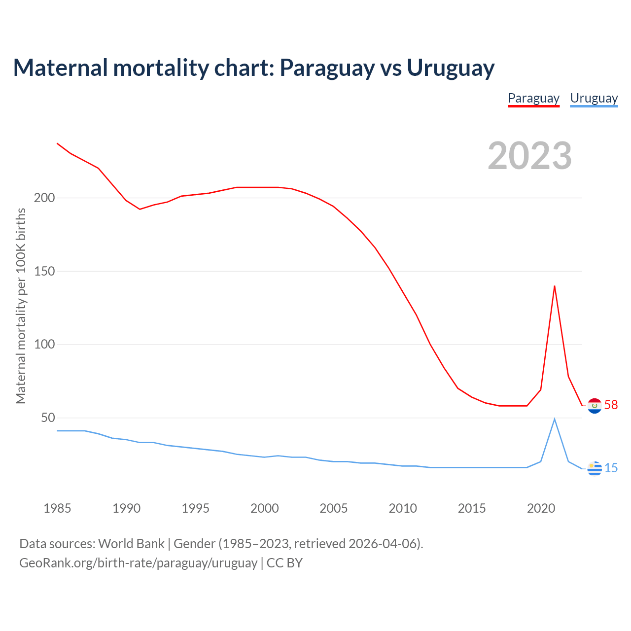 The maternal mortality rate, which is the probability of dying during childbirth or within 42 days of pregnancy termination, is 58 deaths per 100,000 live births in Paraguay, compared to 15 deaths in Uruguay.