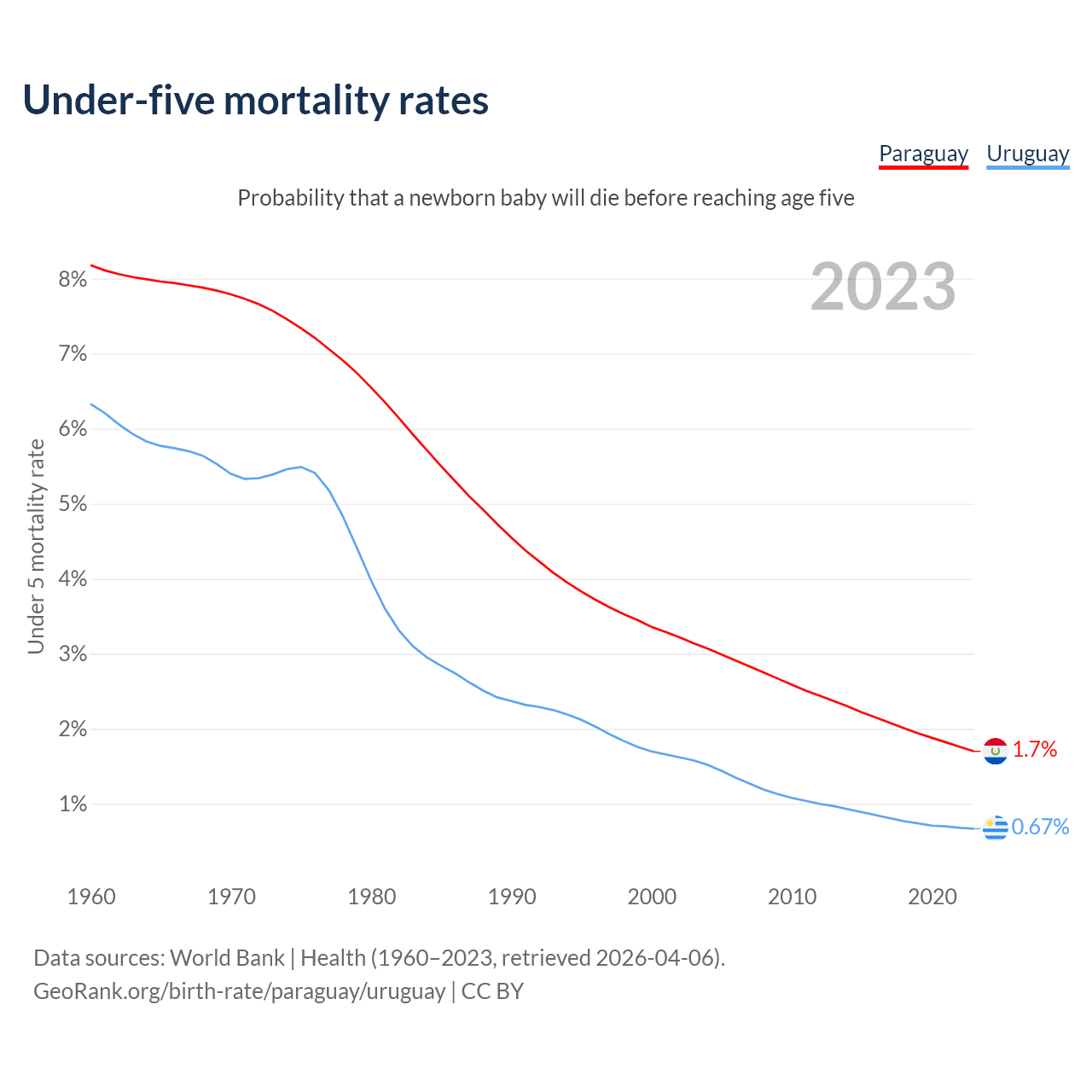 The chance that a newborn baby will die before reaching age five is 1.7% in Paraguay and 0.67% in Uruguay. Above is a chart with historical data on under-five mortality rates.