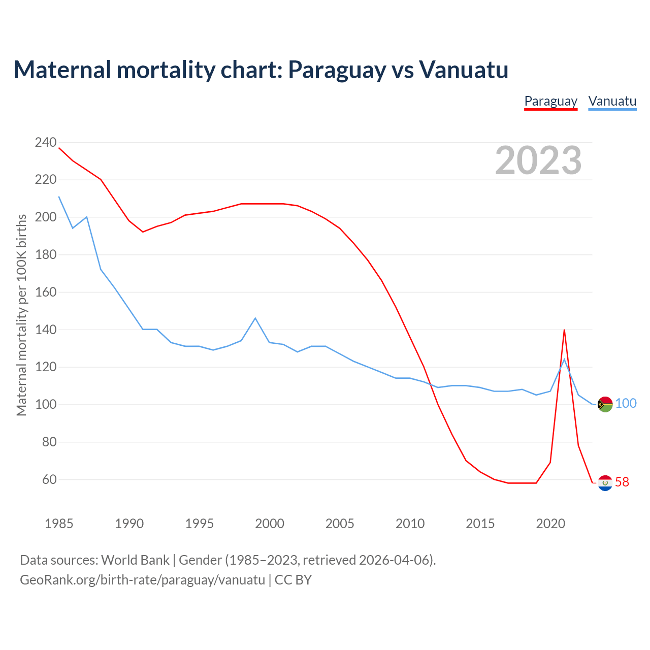 The maternal mortality rate, which is the probability of dying during childbirth or within 42 days of pregnancy termination, is 58 deaths per 100,000 live births in Paraguay, compared to 100 deaths in Vanuatu.
