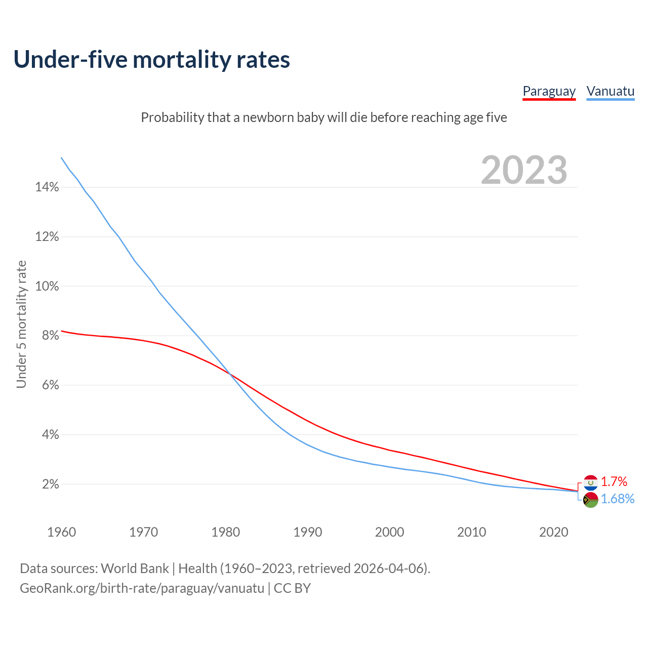 The chance that a newborn baby will die before reaching age five is 1.7% in Paraguay and 1.68% in Vanuatu. Above is a chart with historical data on under-five mortality rates.