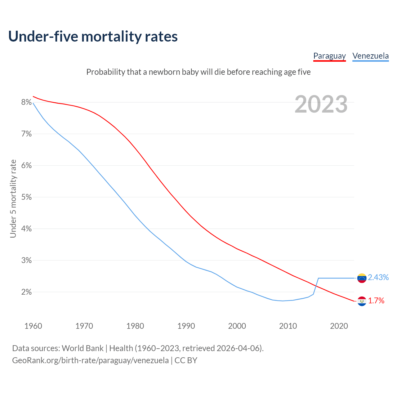 The chance that a newborn baby will die before reaching age five is 1.7% in Paraguay and 2.43% in Venezuela. Above is a chart with historical data on under-five mortality rates.