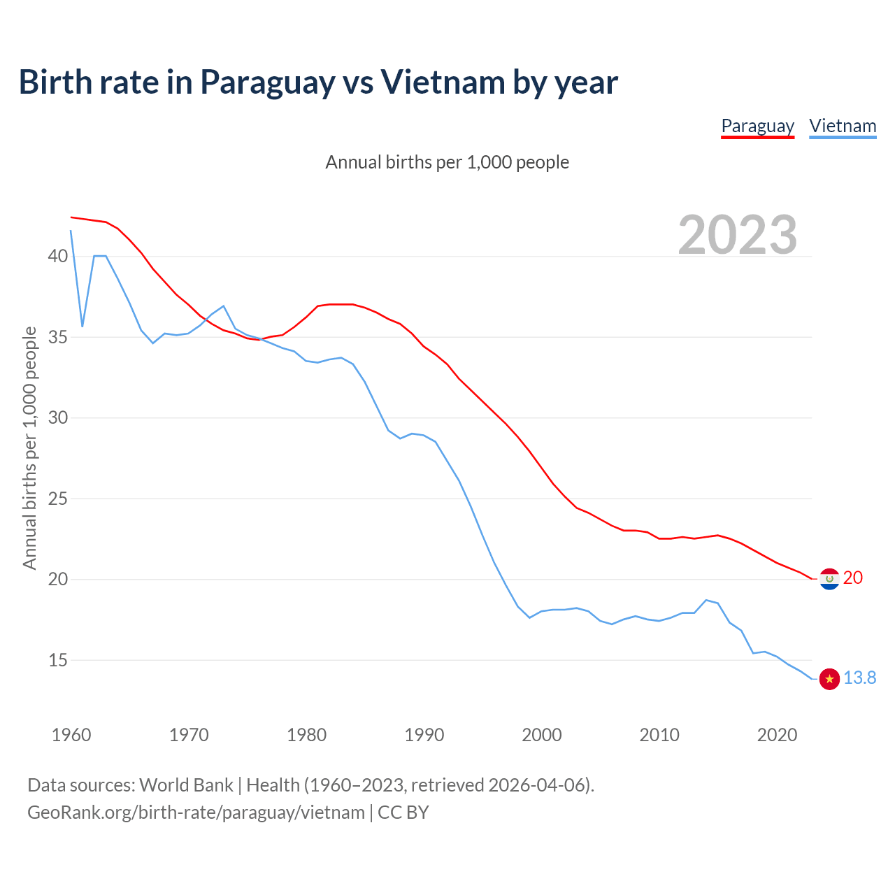 Paraguay has an annual birth rate of 20 births per 1,000 people, compared to 13.8 for Vietnam. The average number of children a woman is expected to have during her lifetime — the fertility rate, is 2.42 in Paraguay and 1.91 in Vietnam — 21% difference.