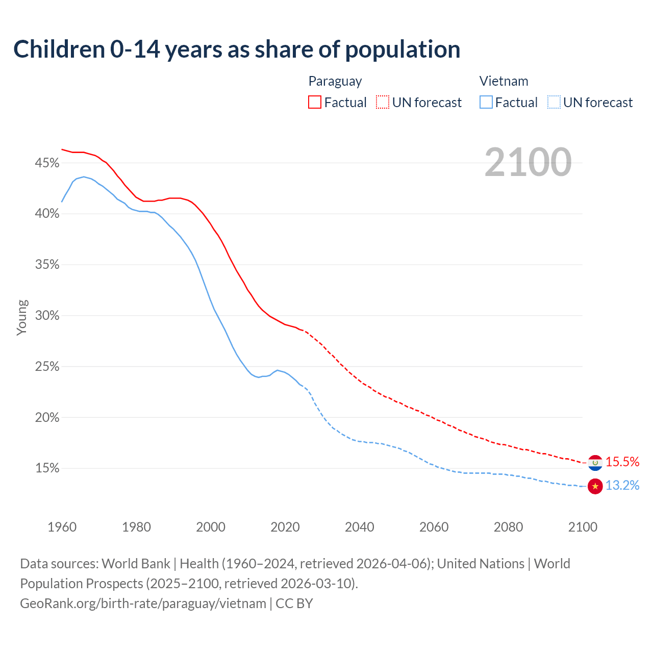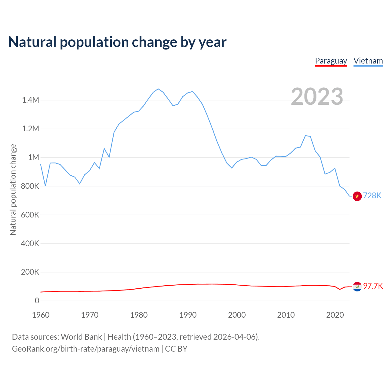 According to the latest available data on birth rates, the fertility rate in Paraguay was 2.42 children per woman in 2023, compared to 1.91 in Vietnam in 2023. The replacement level is considered to be 2.1 children per woman.