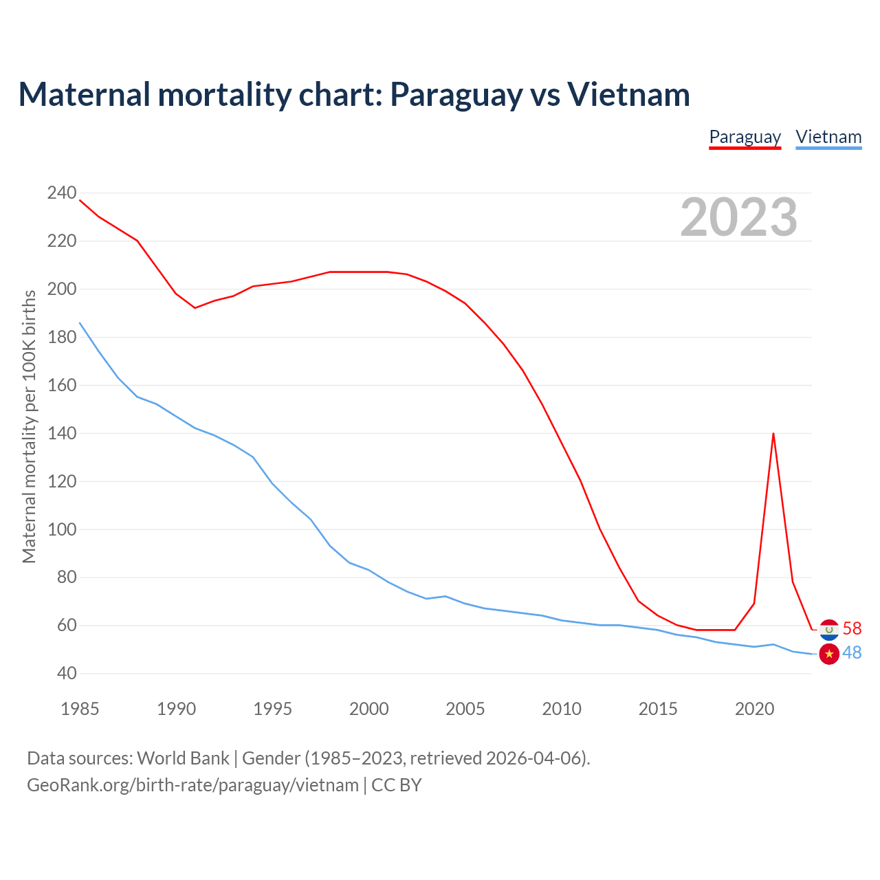 The maternal mortality rate, which is the probability of dying during childbirth or within 42 days of pregnancy termination, is 58 deaths per 100,000 live births in Paraguay, compared to 48 deaths in Vietnam.