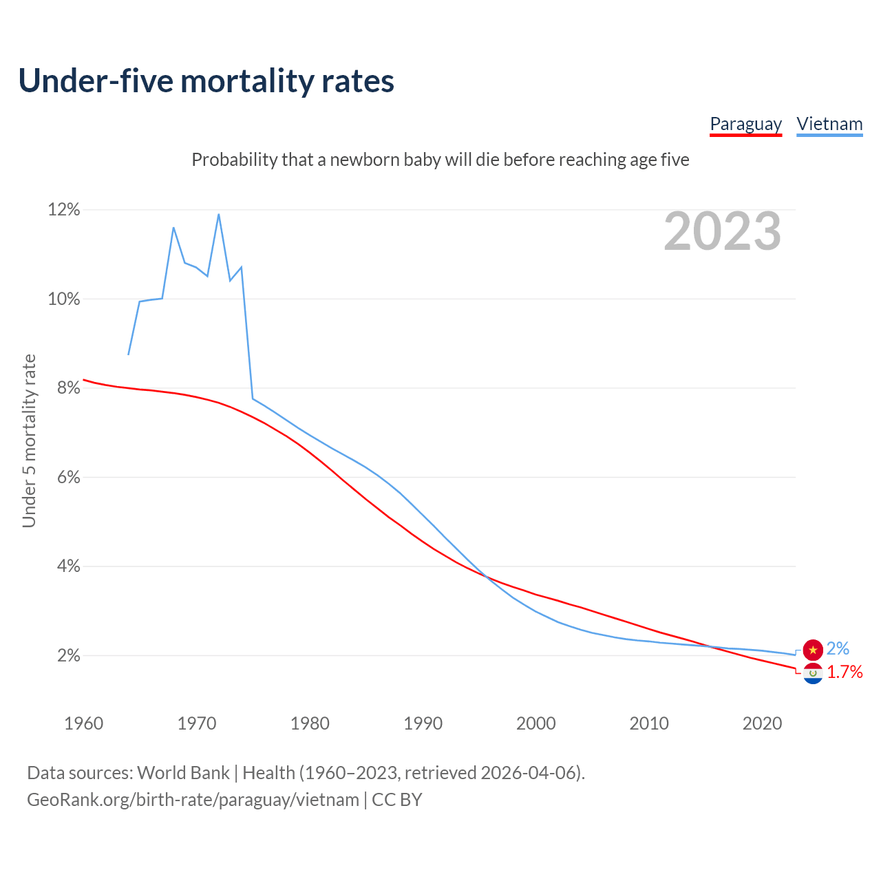 The chance that a newborn baby will die before reaching age five is 1.7% in Paraguay and 2% in Vietnam. Above is a chart with historical data on under-five mortality rates.