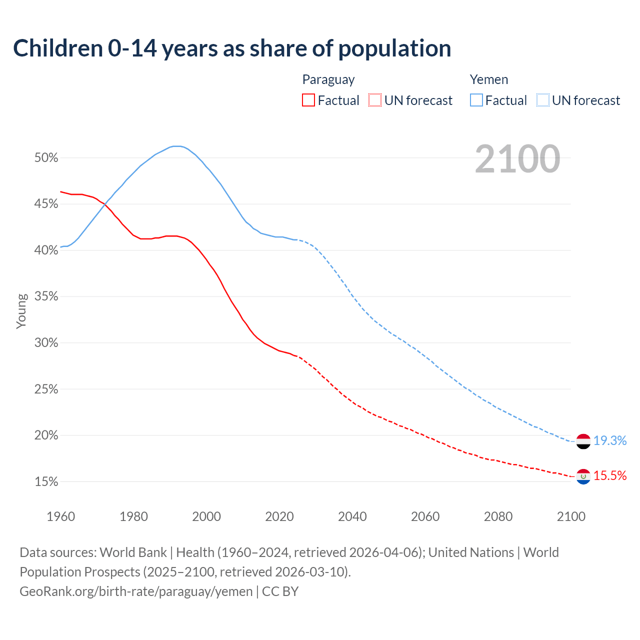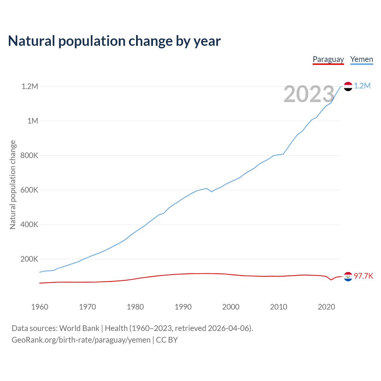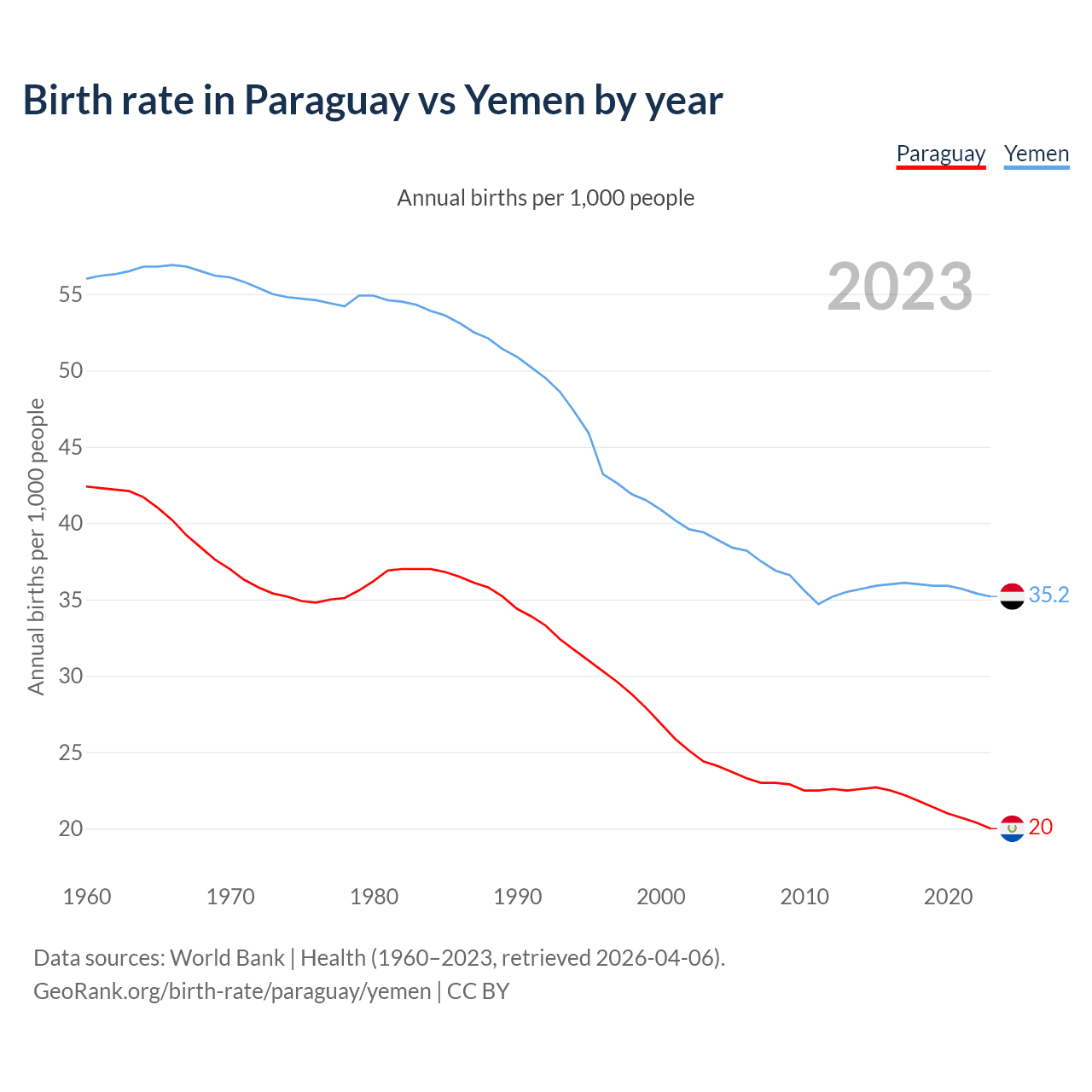 Paraguay has an annual birth rate of 20 births per 1,000 people, compared to 35.2 for Yemen. The average number of children a woman is expected to have during her lifetime — the fertility rate, is 2.42 in Paraguay and 4.59 in Yemen — 89.5% difference.