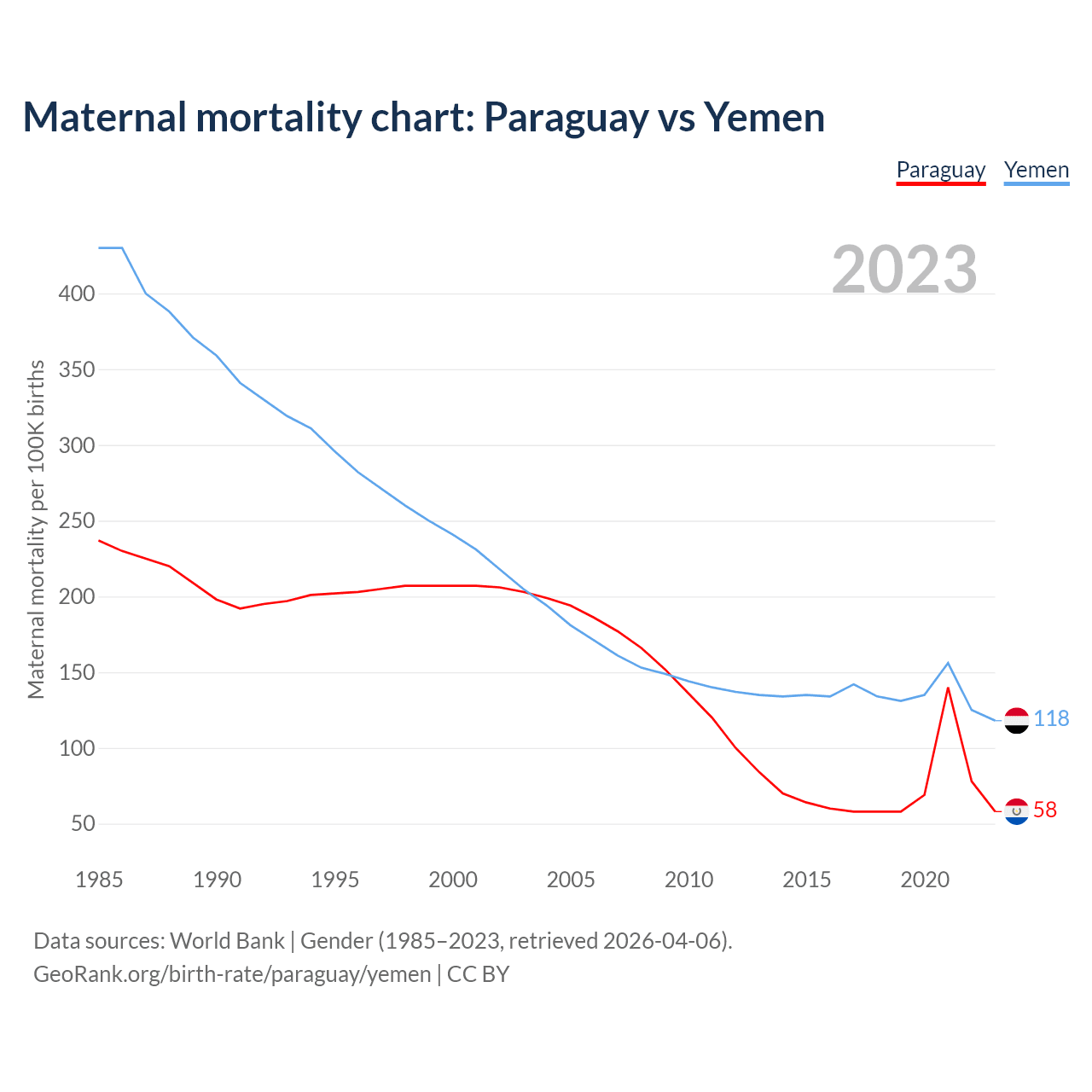 The maternal mortality rate, which is the probability of dying during childbirth or within 42 days of pregnancy termination, is 58 deaths per 100,000 live births in Paraguay, compared to 118 deaths in Yemen.