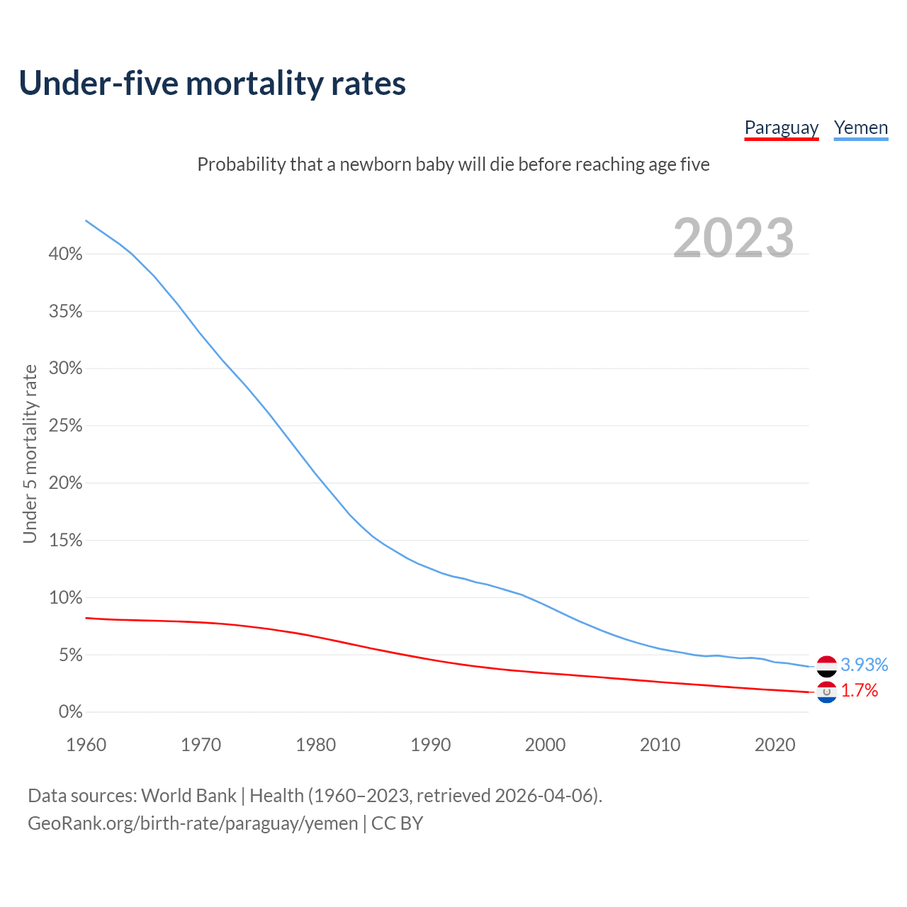 The chance that a newborn baby will die before reaching age five is 1.7% in Paraguay and 3.93% in Yemen. Above is a chart with historical data on under-five mortality rates.