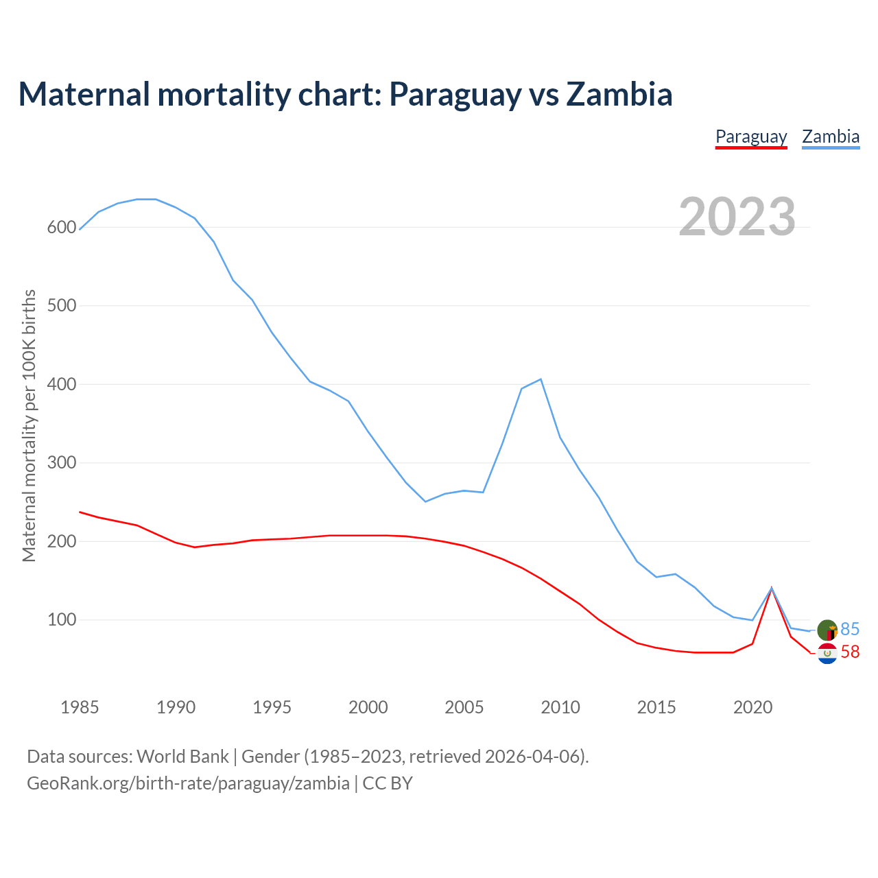 The maternal mortality rate, which is the probability of dying during childbirth or within 42 days of pregnancy termination, is 58 deaths per 100,000 live births in Paraguay, compared to 85 deaths in Zambia.