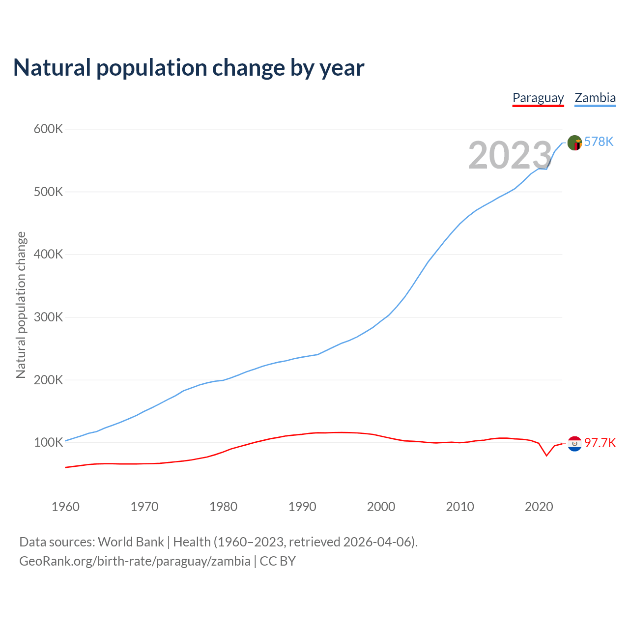 Paraguay has an annual birth rate of 20 births per 1,000 people, compared to 33.1 for Zambia. The average number of children a woman is expected to have during her lifetime — the fertility rate, is 2.42 in Paraguay and 4.1 in Zambia — 69.3% difference.