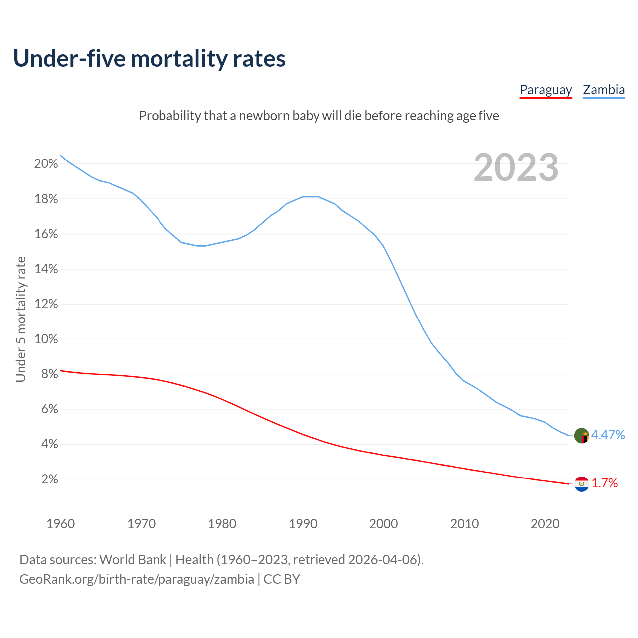 The chance that a newborn baby will die before reaching age five is 1.7% in Paraguay and 4.47% in Zambia. Above is a chart with historical data on under-five mortality rates.