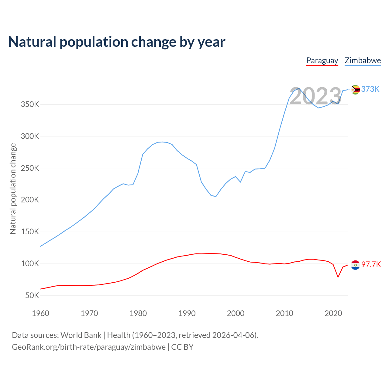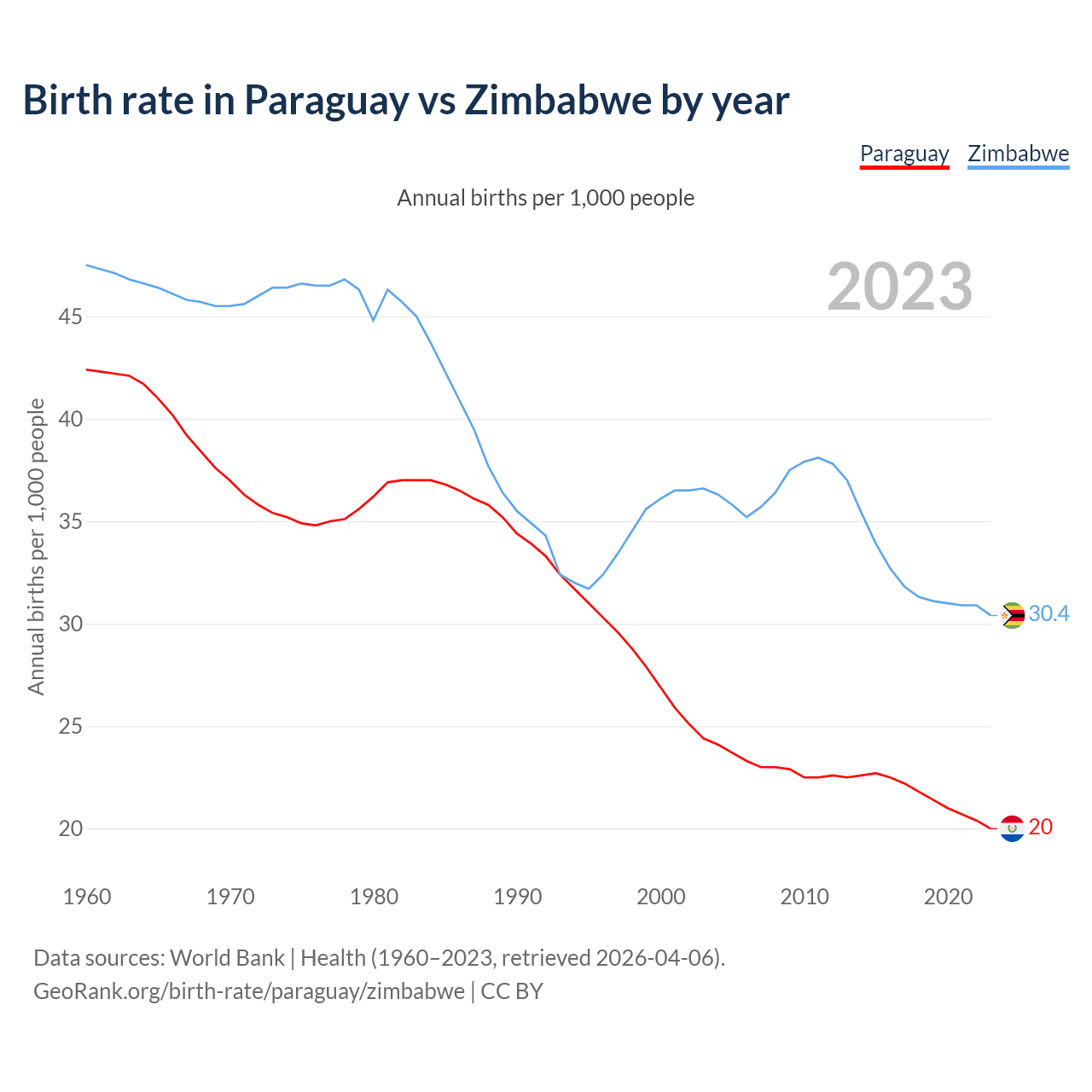 Paraguay has an annual birth rate of 20 births per 1,000 people, compared to 30.4 for Zimbabwe. The average number of children a woman is expected to have during her lifetime — the fertility rate, is 2.42 in Paraguay and 3.72 in Zimbabwe — 53.8% difference.