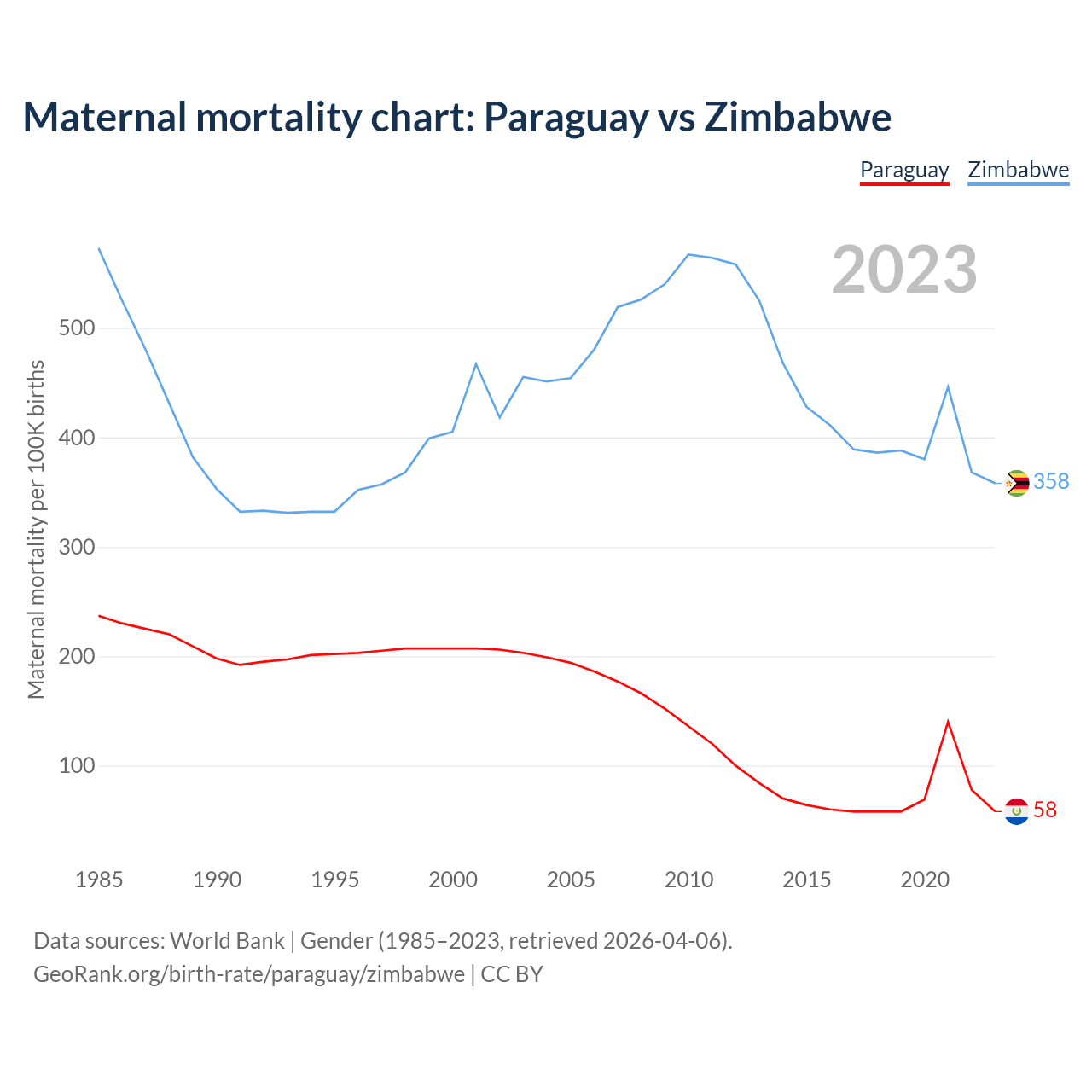 The maternal mortality rate, which is the probability of dying during childbirth or within 42 days of pregnancy termination, is 58 deaths per 100,000 live births in Paraguay, compared to 358 deaths in Zimbabwe.