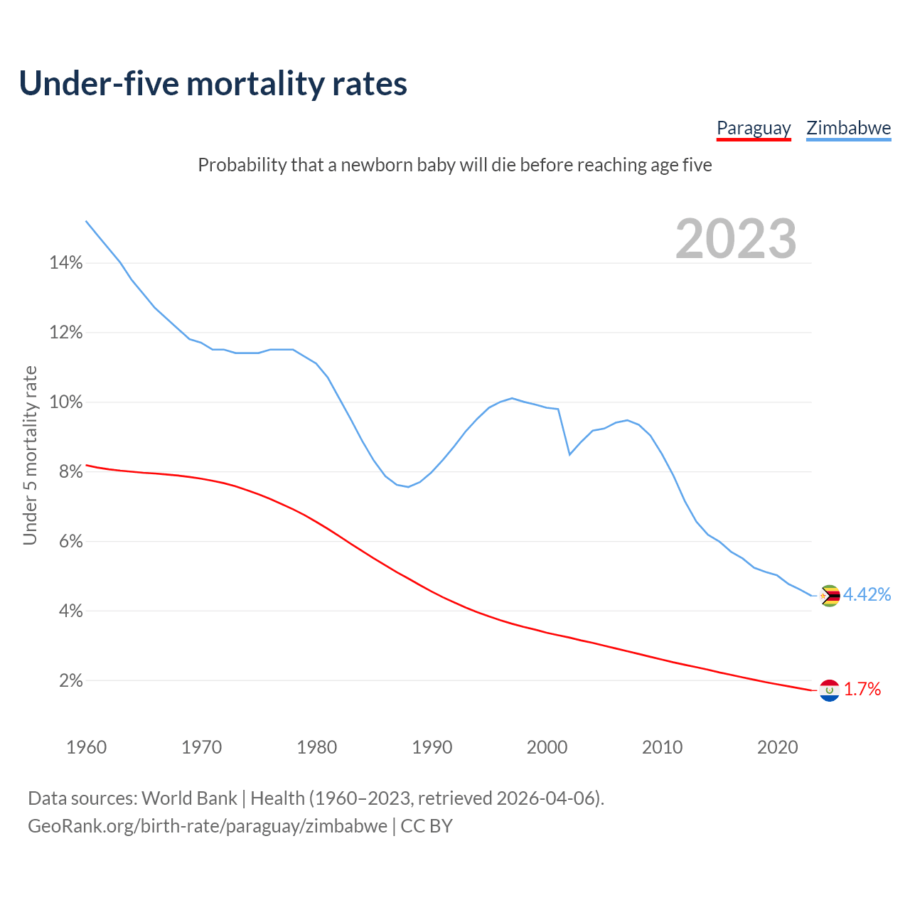 The chance that a newborn baby will die before reaching age five is 1.7% in Paraguay and 4.42% in Zimbabwe. Above is a chart with historical data on under-five mortality rates.