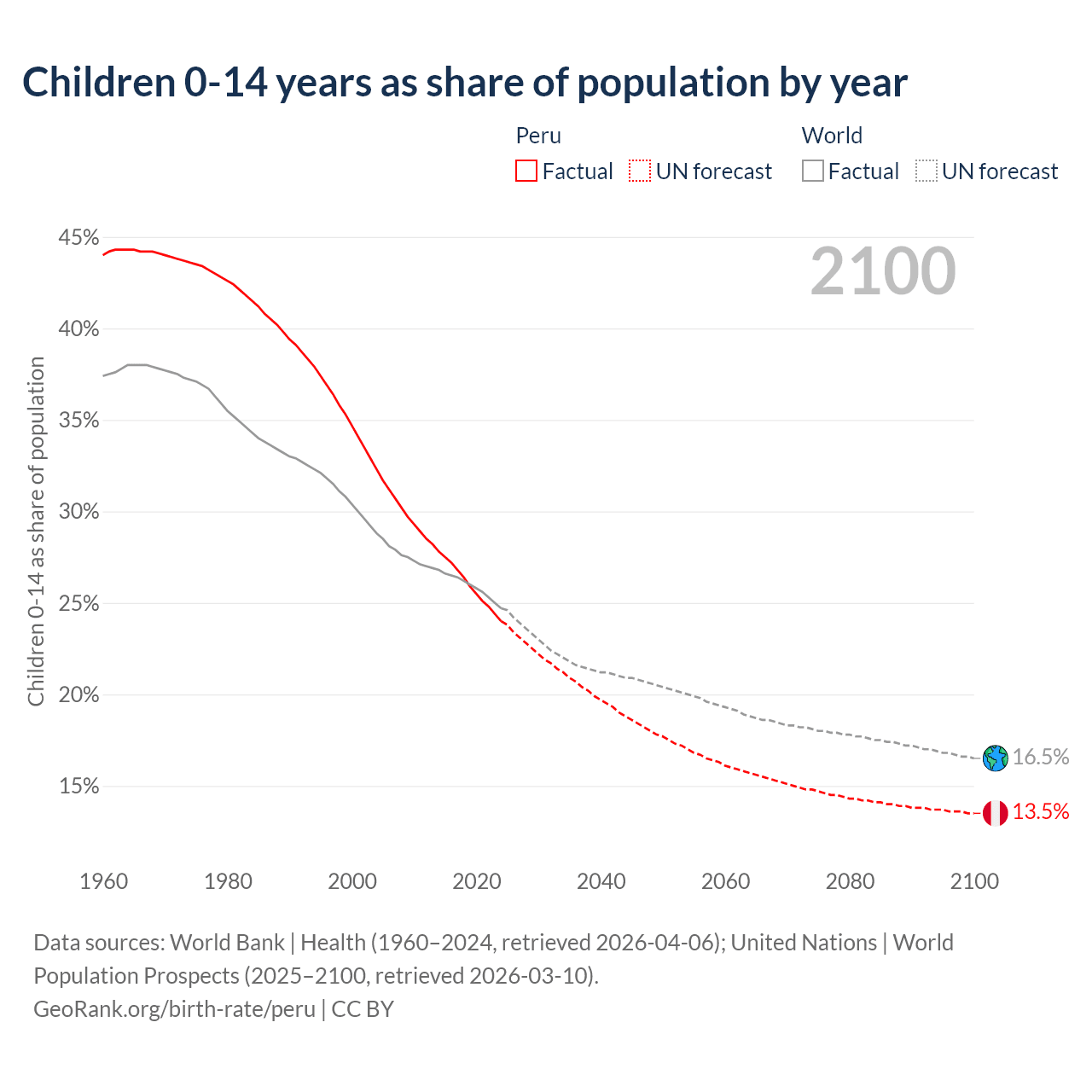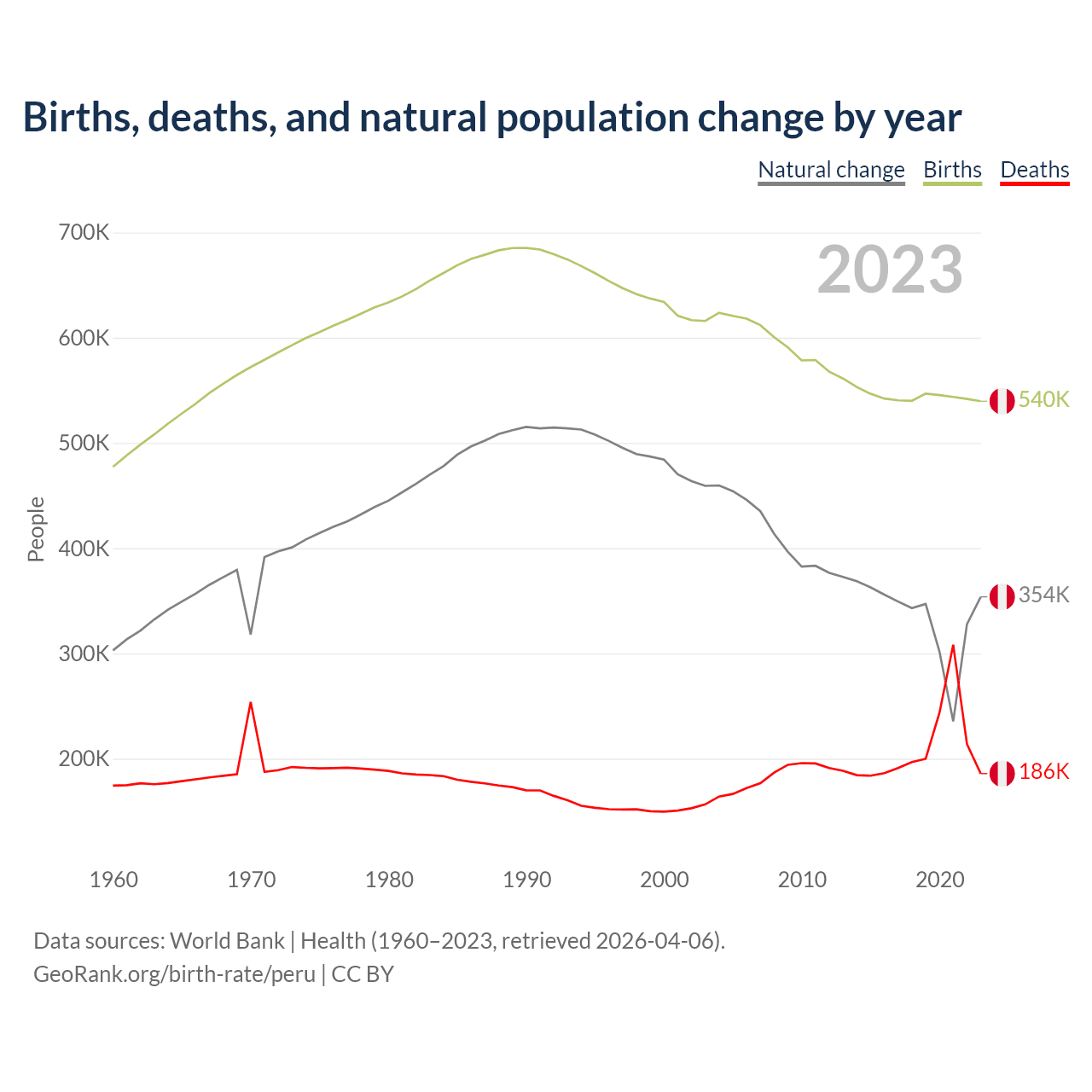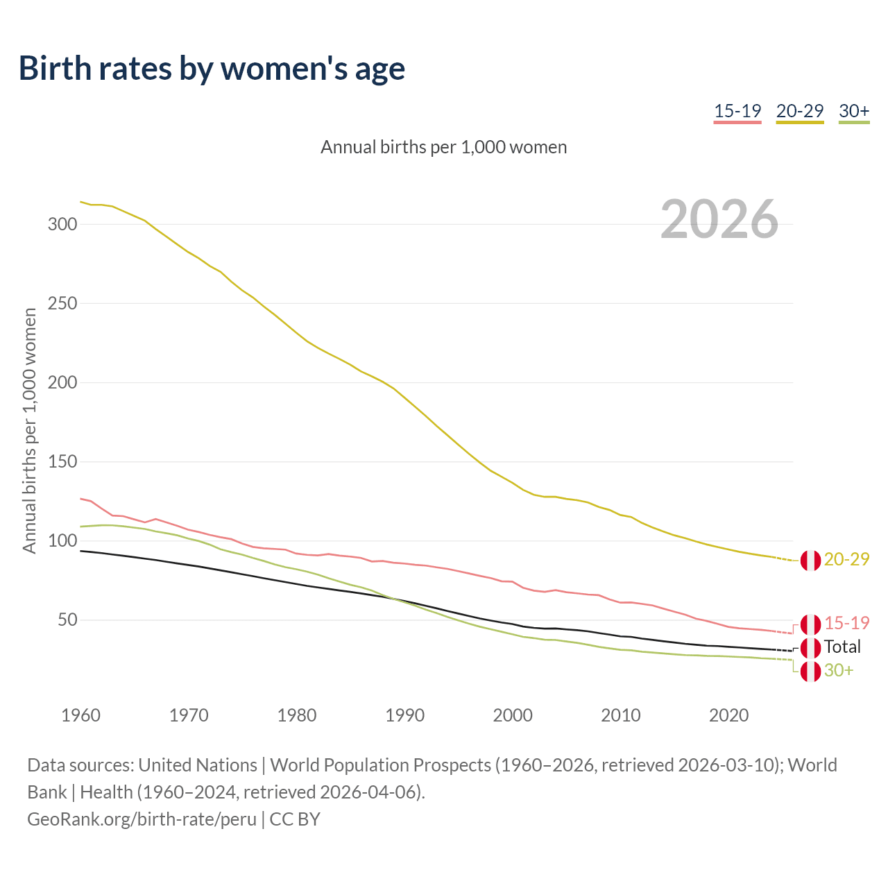 According to the latest birth rate data available, the fertility rate in Peru was 1.98 in 2023 and has been below the replacement level of 2.1 children per woman since 2019. In 1993, the fertility rate was 3.55 — a 44.3% decline in 30 years.