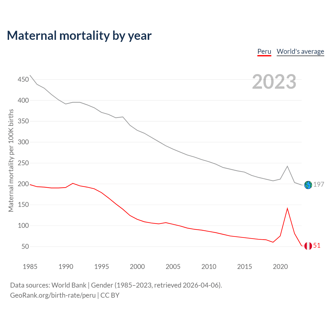 The maternal mortality rate in Peru was 51 deaths per 100,000 live births in 2023 — a 0.05% chance of dying during childbirth or within 42 days of pregnancy termination. This is a 55.7% decrease compared to the year 2000.