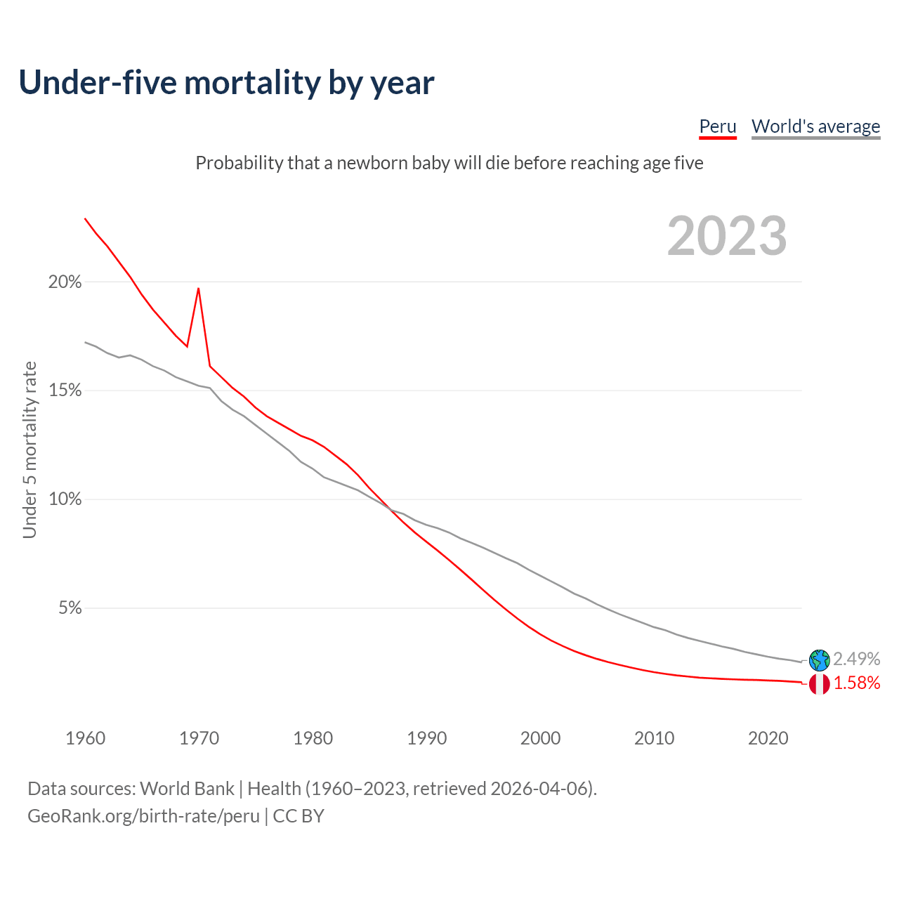 The under-5 mortality rate in Peru was 15.8 deaths per 1,000 live births in 2023 — a 1.58% chance that a newborn baby will die before reaching age five. This is down from 37.9 deaths per 1,000 live births in 2000.