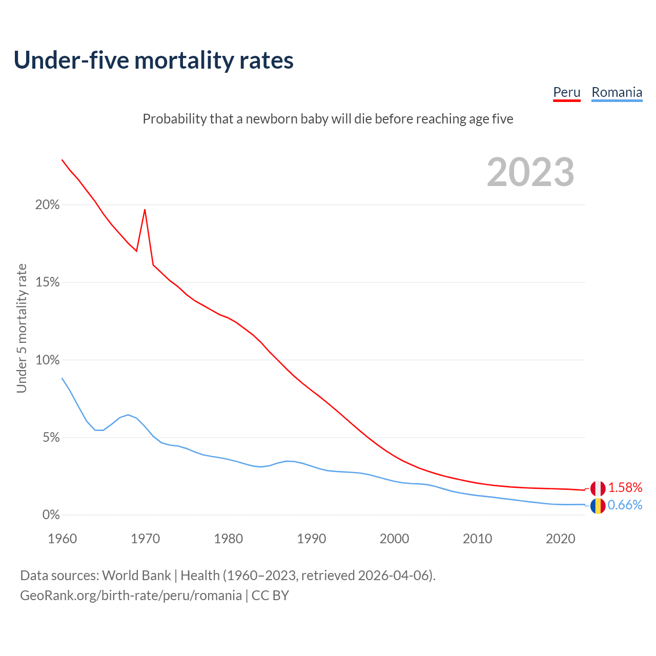 The chance that a newborn baby will die before reaching age five is 1.58% in Peru and 0.66% in Romania. Above is a chart with historical data on under-five mortality rates.
