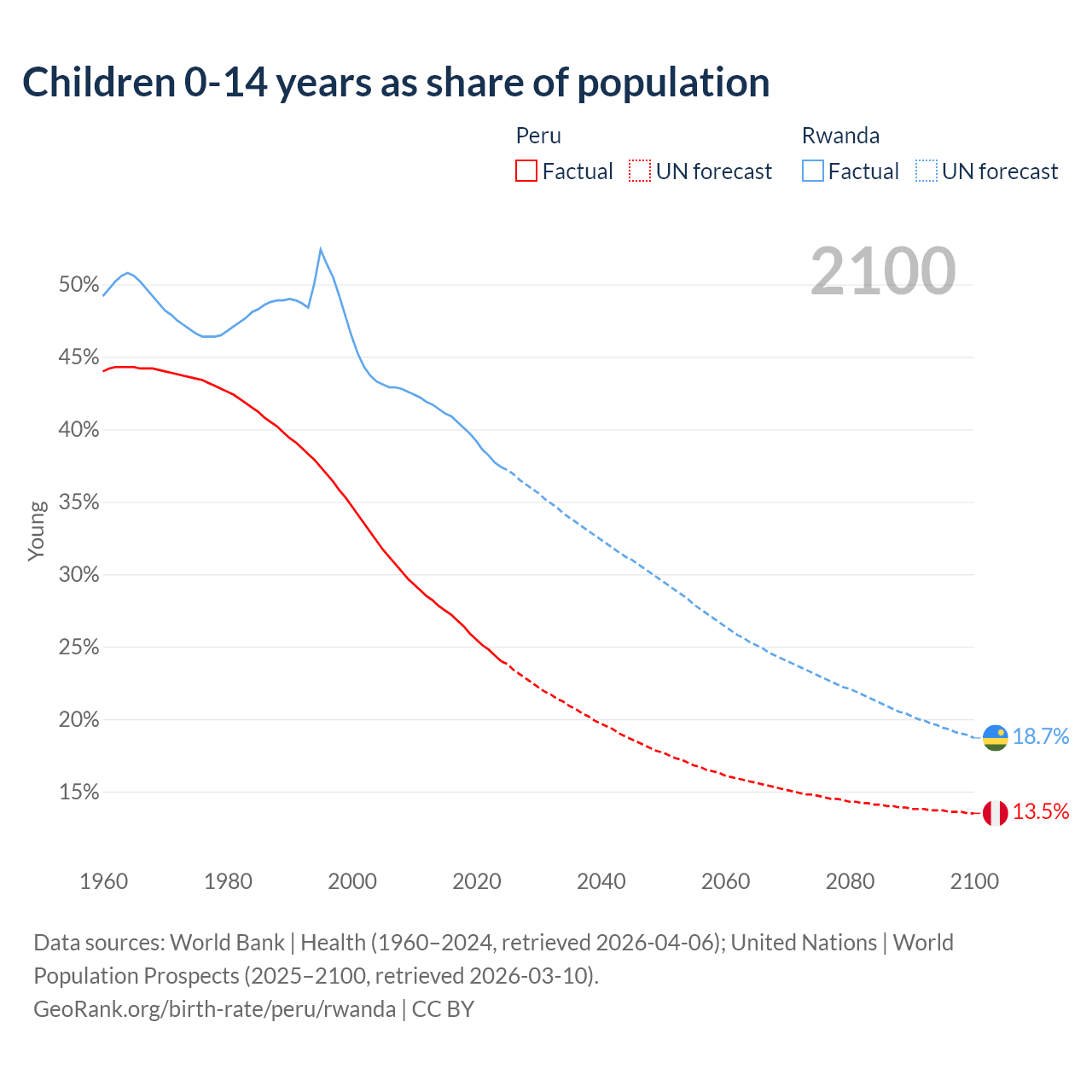 According to the latest available data on birth rates, the fertility rate in Peru was 1.98 children per woman in 2023, compared to 3.7 in Rwanda in 2023. The replacement level is considered to be 2.1 children per woman.