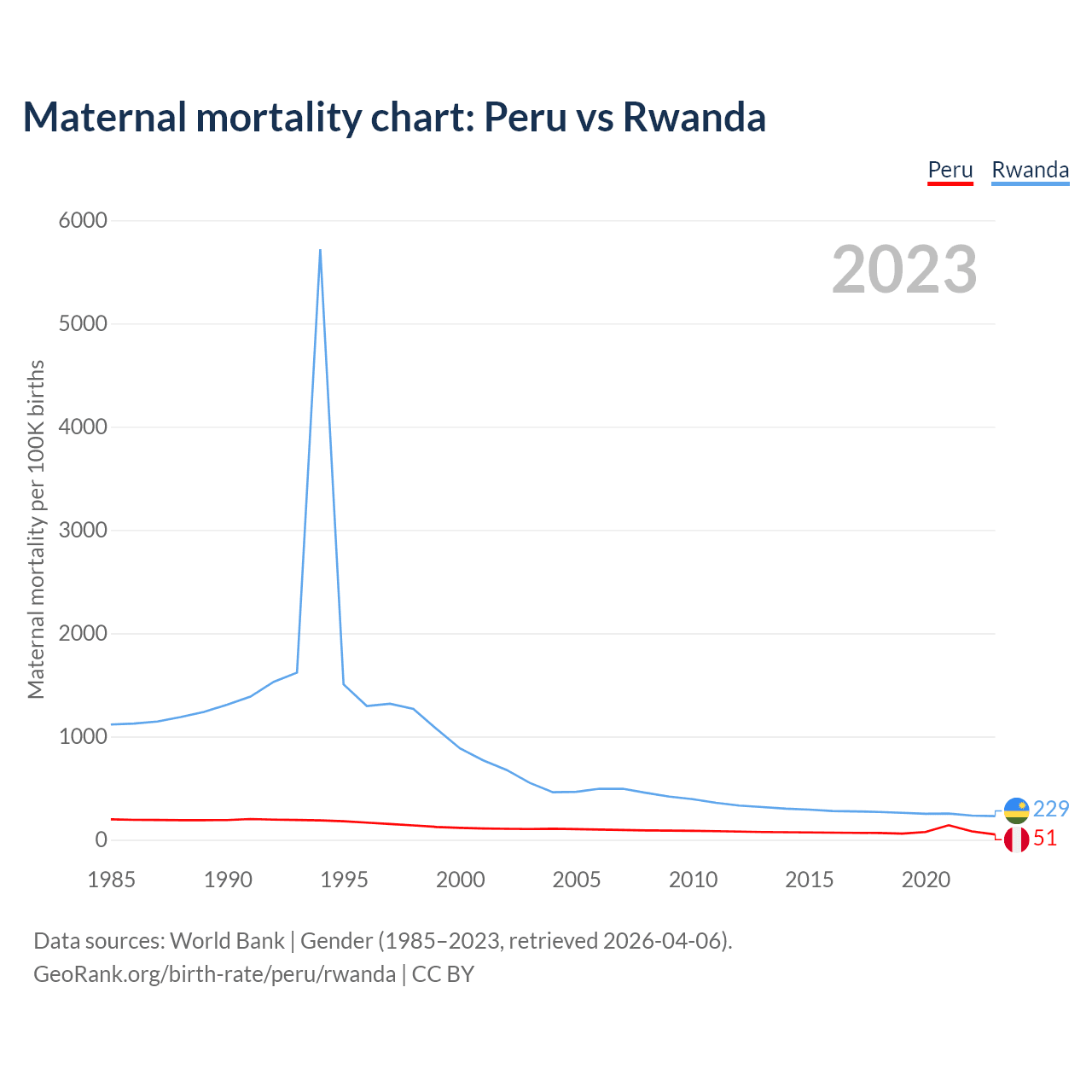 The maternal mortality rate, which is the probability of dying during childbirth or within 42 days of pregnancy termination, is 51 deaths per 100,000 live births in Peru, compared to 229 deaths in Rwanda.
