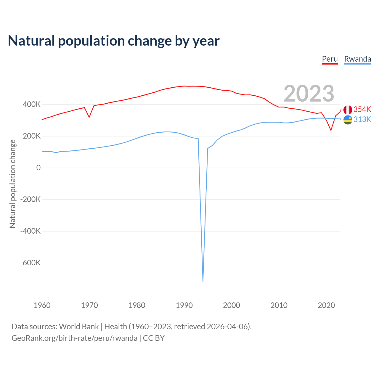 Peru has an annual birth rate of 15.9 births per 1,000 people, compared to 28.3 for Rwanda. The average number of children a woman is expected to have during her lifetime — the fertility rate, is 1.98 in Peru and 3.7 in Rwanda — 86.8% difference.