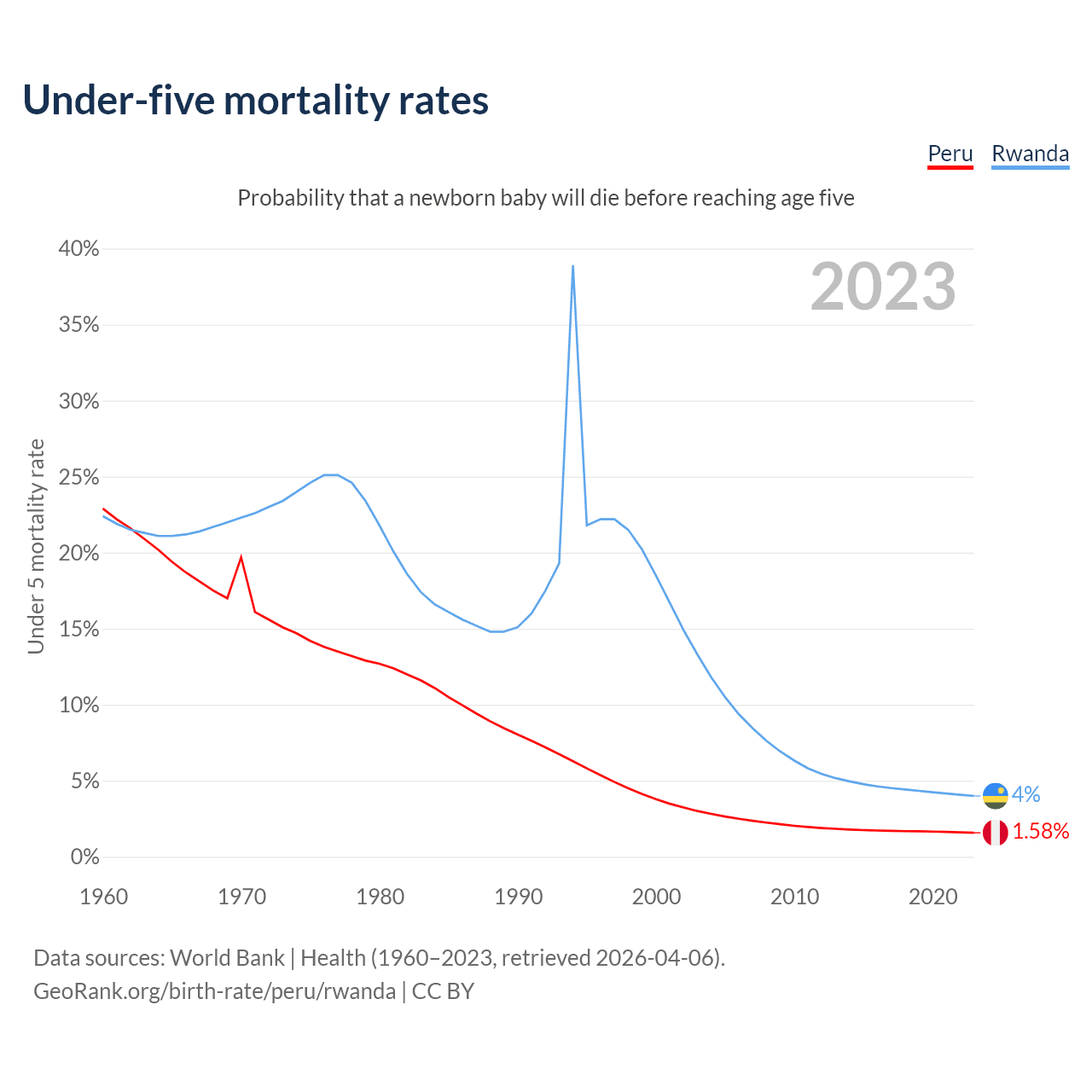 The chance that a newborn baby will die before reaching age five is 1.58% in Peru and 4% in Rwanda. Above is a chart with historical data on under-five mortality rates.